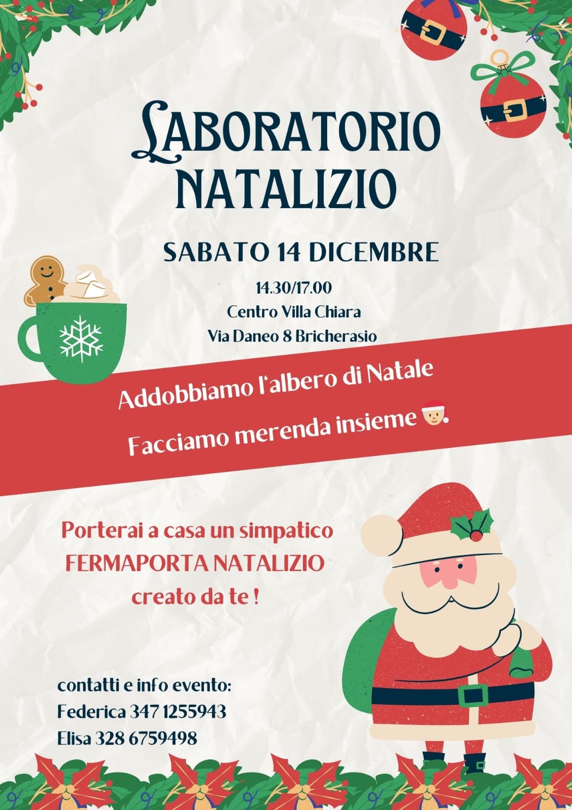 A Villa Chiara, in Via Daneo, 8 a Bricherasio si organizza un laboratorio per bambini per sabato 14 a partire dalle 14,30 per addobbare insieme l’albero di Natale e per fare merenda insieme e i partecipanti porteranno a casa un simpatico fermaporta natalizio creato da loro stessi. Per maggiori informazioni telefonare a Federica al 3471255943 oppure a Elisa al numero 3286759498.