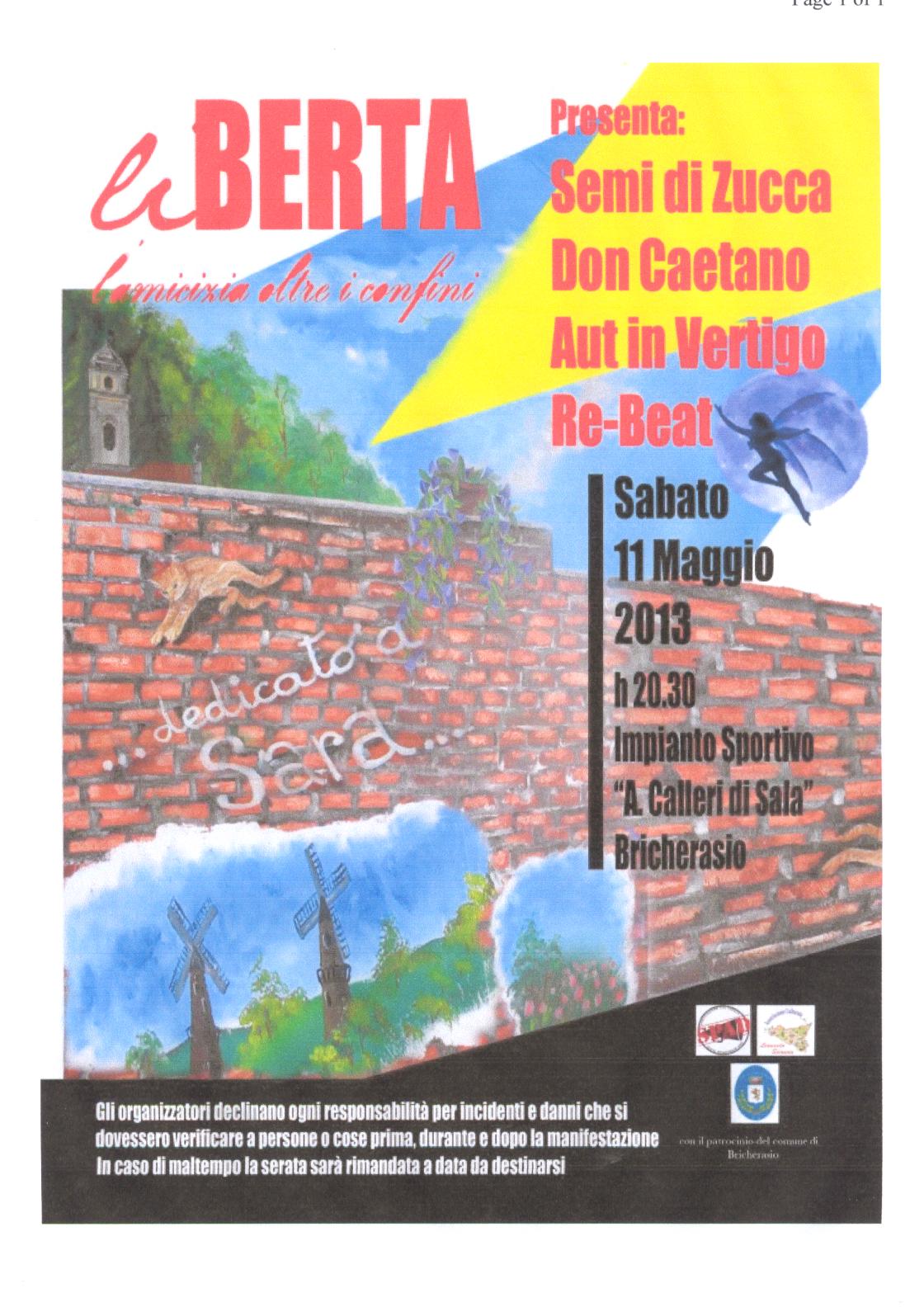 Sabato 11 maggio agli impianti sportivi “Guido Calleri di Sala” di Bricherasio concerto in memoria di Sara, la giovane bricherasiese prematuramente scomparsa un anno fa. Dopo averle dedicato il murales posizionato sotto il ponte che dà inizio alla pista ciclabile Bricherasio-Campiglione sulla ex ferrovia Bricherasio-Barge al quale aveva inizialmente partecipato e il torneo di calcio con Pinerolo F.D. e Torino F.D., ora gli amici organizzano una serata di musica chiamata “liBERTA, l’amicizia oltre il confine”. Si ebisiscono gli Aut in Vertigo, Heart rock band di 5 elementi della provincia di Torino, che da il meglio di sé sul palco, i Semi di Zucca gruppo bricherasiese formato da sette elementi che suona musica tradizionale africana, i Re-Beat giovane band torinese di tre uomini e una ragazza, che propone il beat italiano anni 60 come non lo avete mai sentito e Don Caetano o più semplicemrnte "il DonCa", band pinerolese formata da tre a dieci/ undici babbuzzi, intercambiabili e riciclabili, encomiabili ed improvvisati. La filosofia del "levare" portata all'estremo dell'ascoltabile. La filosofia del "levare" portata all'estremo dell'ascoltabile. Il DonCa suona e canta con più voci, due kazoo, una o due chitarre, batteria e percussioni, fischietti, un D.J. e tutti coloro che lì presenti sanno suonare (anche male, non importa) uno strumento e hanno il piacere di unirsi alla buenaonda dei babbuzzi. L’evento è organizzato dagli amici di Sara che si sono avvalsi della collaborazione del Comune di Bricherasio, dell’Associazione Culturale “Leonardo Sciascia” e dell’Associazione Culturale “Spadonair”. Buona musica, servizio bar e ristoro!!! Dai ragazzi, vi aspettiamo e l’energia di Sara prende forma nelle più svariate forme e adoriamo quando ti trasformi in vento e accarezzi i visi. Arrivederci Berta ruba tutte le note che voleranno per te nell’aria le riascolteremo insieme quando ci incontreremo di nuovo.