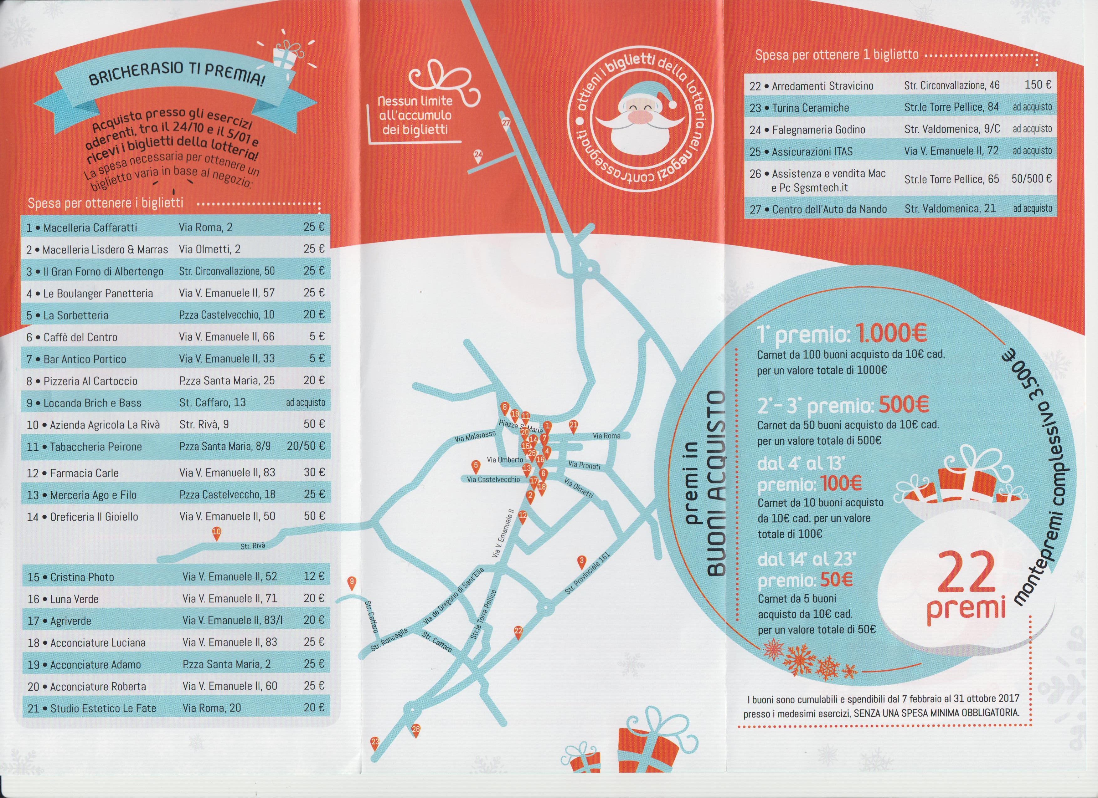 La rinnovata Associazione Commercianti, Artigiani e Aziende Agricole di Bricherasio dopo le elezioni di marzo, l’organizzazione della nona rassegna “Botteghe in piazza” del 2 giugno e l'Apericena sotto le stelle al Castello in occasione della 48^ Sagra dell'Uva per il quale sono stati raccolti e donati 500 € alle popolazioni terremotate per l'acquisto di una roulotte, adesso presenta una nuova iniziativa: la lotteria di Natale denominata “Acquista a Bricherasio e vinci”. Da lunedì 24 ottobre fino a giovedì 5 gennaio 2017. Venerdì 6 gennaio festa con apericena a partire dalle ore 18 al Salone Polivalente di Piazza Don Morero con l’estrazione dei biglietti vincenti. Per il presidente Luca Peirone “La lotteria rientra in una logica di promozione del territorio e degli esercizi commerciali patrocinata dal Comune”. I ventisette esercizi aderenti (sono variabili gli importi minimi per l’ottenimento del ticket) sono le Macellerie Lisdero & Marras e Caffaratti, il Caffè del Centro, la tabaccheria Peirone,la farmacia Carle,lo studio estetico Le Fate,il mobilificio Arredamenti Stravicino, acconciature Luciana, Luna Verde, Cristina Photo, acconciature Adamo, Azienda Agricola La Rivà, Bar Antico Portico, Pizzeria Al Cartoccio, oreficeria Il Gioiello, il Gran Forno di Albertengo, acconciature Roberta, panetteria Le Boulanger, La Sorbetteria, merceria Ago & Filo, Locanda Brich e Bass, Agriverde, Turina Ceramiche, Assicurazioni ITAS, Studio Grafico Simona Mensa, Centro dell’Auto e falegnameria Godino. Gli organizzatori mettono a disposizione un montepremi complessivo di 3500 € in buoni acquisto spendibili dal 7 febbraio a fine ottobre 2017, senza una minima spesa obbligatoria, nei sopracitati esercizi. Il primo premio consiste in un carnet di 100 buoni acquisto da 10 € per un totale complessivo di 1000 €. Il secondo e terzo vincono 500 € a testa e dal quarto al tredicesimo il valore totale dei buoni è di 100 €, infine fino al ventiduesimo premio cinque carnet da 10 € sempre in buoni acquisto per una vincita di 50 €.