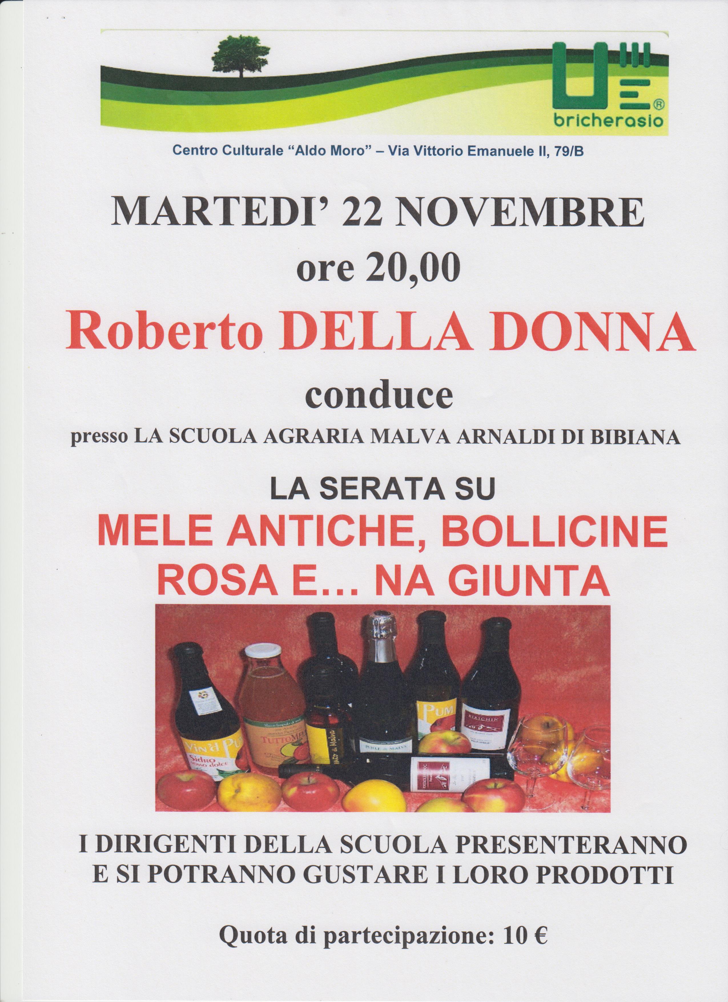 L'Unitre presenta per martedì 22 novembre una serata con Roberto Della Donna che conduce "Mele antiche, bollicine rosa e... na giunta" alla Scuola Malva Arnaldi di Bibiana con i dirigenti della Scuola che presentano i loro prodotti e possibilità di degustazione. Quota di partecipazione 10 €.