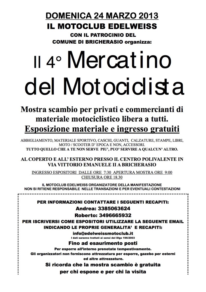 Il Motoclub Edelweiss di Bricherasio, con il patrocinio del Comune di Bricherasio, organizza per Domenica 24 marzo la quarta edizione de “Il mercatino del motociclista”, mostra scambio per privati e commercianti di materiale motociclistico con esposizione libera a tutti. L’evento si svolge al coperto ed all’esterno del Salone Polivalente di Via Vittorio Emanuele II, a Bricherasio dove ogni appassionato potrà esporre e scambiare il proprio surplus di materiale motociclistico come abbigliamento, accessori, manuali di officina, stampe e riviste del settore. L’esposizione dei prodotti, ad ingresso gratuito, comincia alle ore 9,00 e termina alle 18,30. Per aderire alla manifestazione si deve utilizzare fino ad esaurimento posti il sito internet all’indirizzo info@edelweissmotoclub.it indicando le proprie generalità e recapiti. Per informazioni contattare Andrea al 338/5063624 o Roberto al numero 349/6665932.