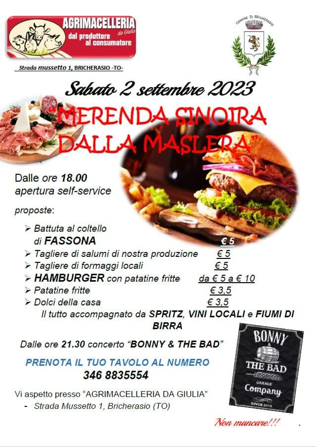 Sabato 2 settembre dalle ore 18.00 con la “Merenda sinoira dalla maslera”, proposta dall’Agrimacelleria Da Giulia nel proprio locale di Strada Mussetto, 1 a Cappella Moreri alla quale segue il concerto del groppo “Bonny e the bad” si aprono i festeggiamenti della 55^ Sagra dell'Uva bricherasiese. Per prenotazioni chiamare il 346/8835554.