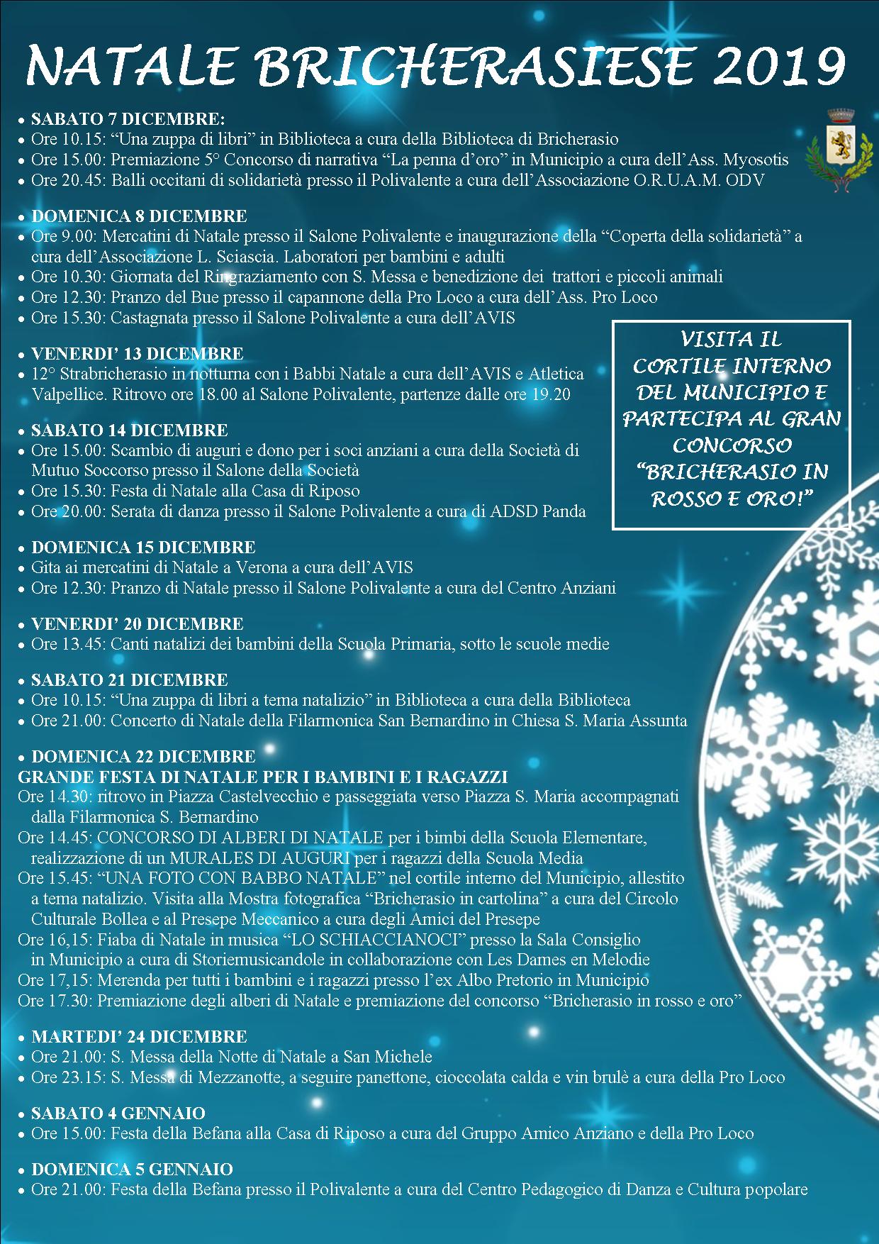 Calendario iniziative in programma a Brcherasio, a cura delle associazioni locali e del Comune, per il mese di dicembre e per il periodo natalizio.
