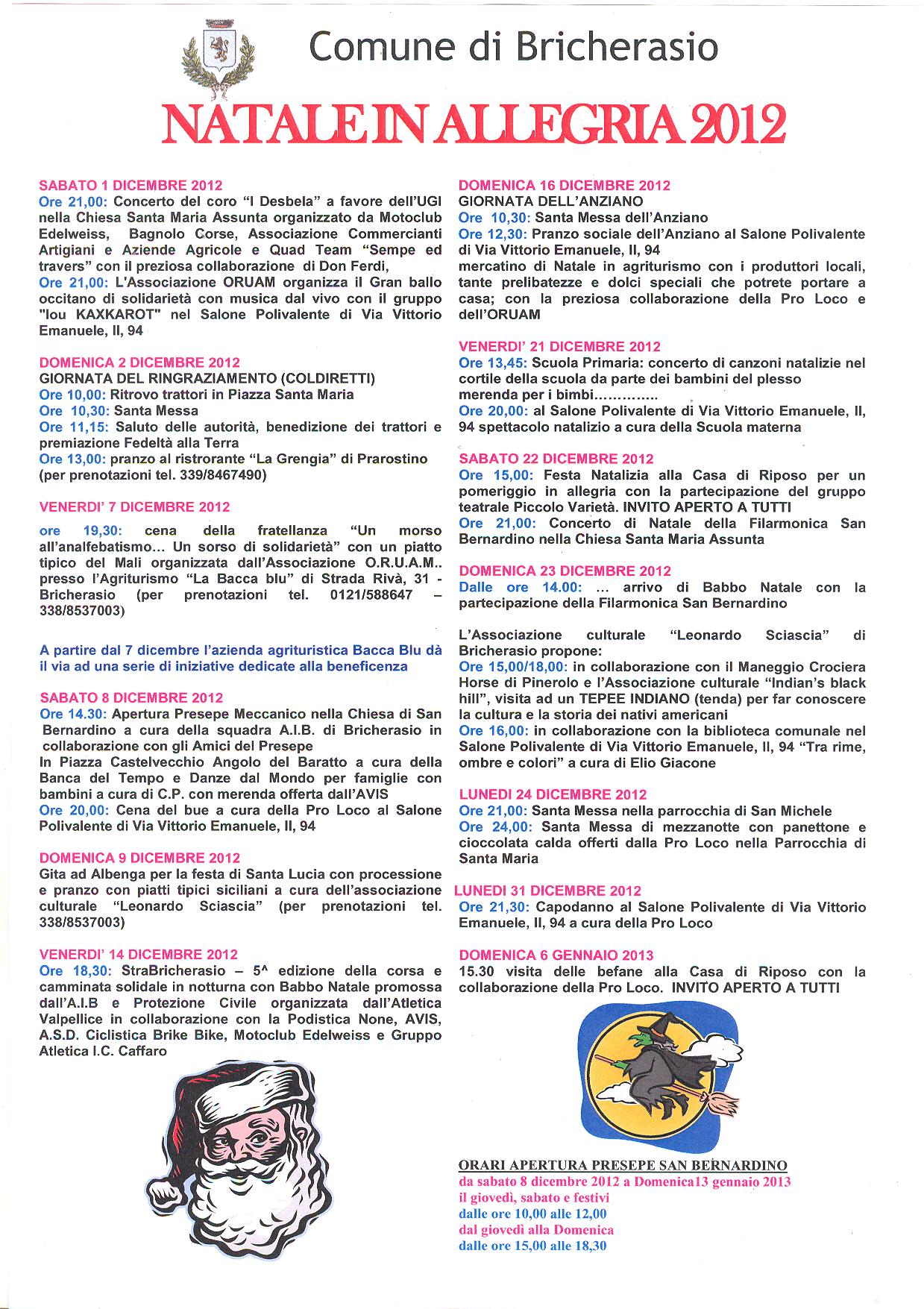 A Bricherasio torna il “Natale in Allegria 2012”, giunto alla 14^ edizione, organizzato dal Comune con la collaborazione di numerose associazioni bricherasiesi. Venerdì 21 alle Scuole concerto di canzoni natalizie nel cortile da parte dei bambini del plesso e merenda per i bimbi e alle 20,00 al Salone Polivalente spettacolo natalizio a cura della Scuola materna Serena. Sabato 22 dalle 15,00 Festa Natalizia alla Casa di Riposo per un pomeriggio in allegria con la partecipazione del gruppo teatrale Piccolo Varietà. La sera immancabile concerto di Natale della Filarmonica San Bernardino nella Chiesa Santa Maria Assunta. La Domenica dalle ore 14.00 arrivo di Babbo Natale con la partecipazione della Filarmonica San Bernardino mentre l’Associazione culturale “Leonardo Sciascia” propone, in collaborazione con il Maneggio Crociera Horse di Pinerolo e l’Associazione culturale “Indian’s black hill”, la visita ad un TEPEE INDIANO (tenda) per far conoscere la cultura e la storia dei nativi americani. Alle 16,00 la biblioteca comunale presenta nel Salone Polivalente “Tra rime, ombre e colori” a cura di Elio Giacone. La vigilia di Natale le Messe nella parrocchia di San Michele alle 21,00 e a mezzanotte la Santa Messa con panettone e cioccolata calda offerti dalla Pro Loco nella Parrocchia di Santa Maria. San Silvestro si festeggia l’ultimo giorno dell’anno 2012 al Salone Polivalente con il Capodanno a cura della Pro Loco.