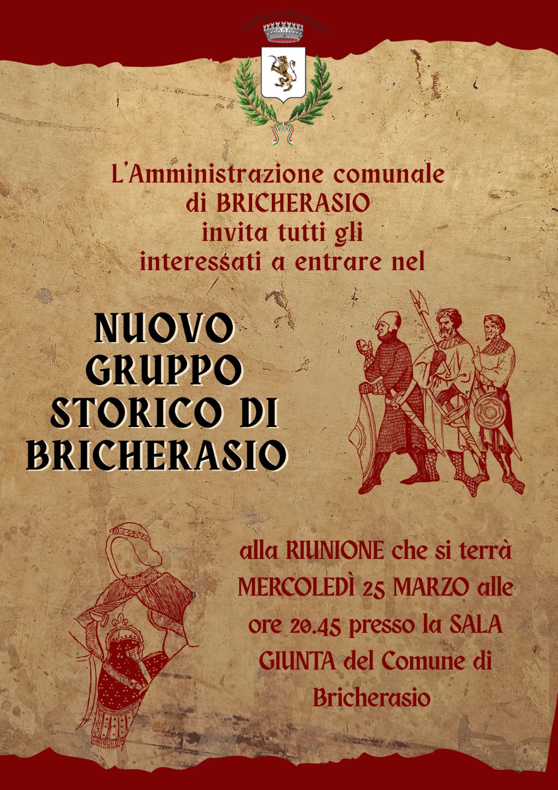 Il Comune di Bricherasio invita tutti gli interessati a far parte del Nuovo Gruppo Storico di Bricherasio. Mercoledì 25 marzo alle ore 20,45 nella Sala Giunta del Comune di Bricherasio si svolgerà un primo incontro informativo ed organizzativo.
