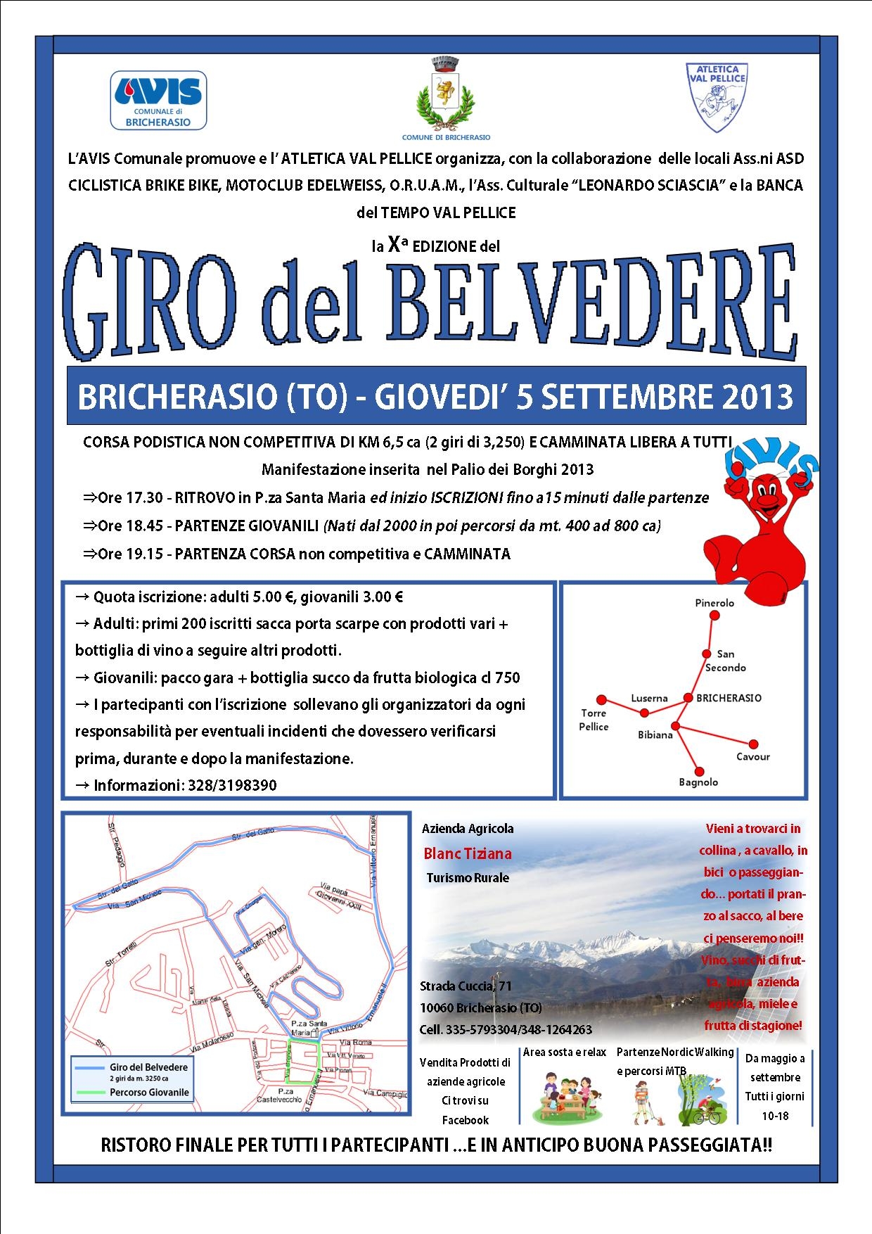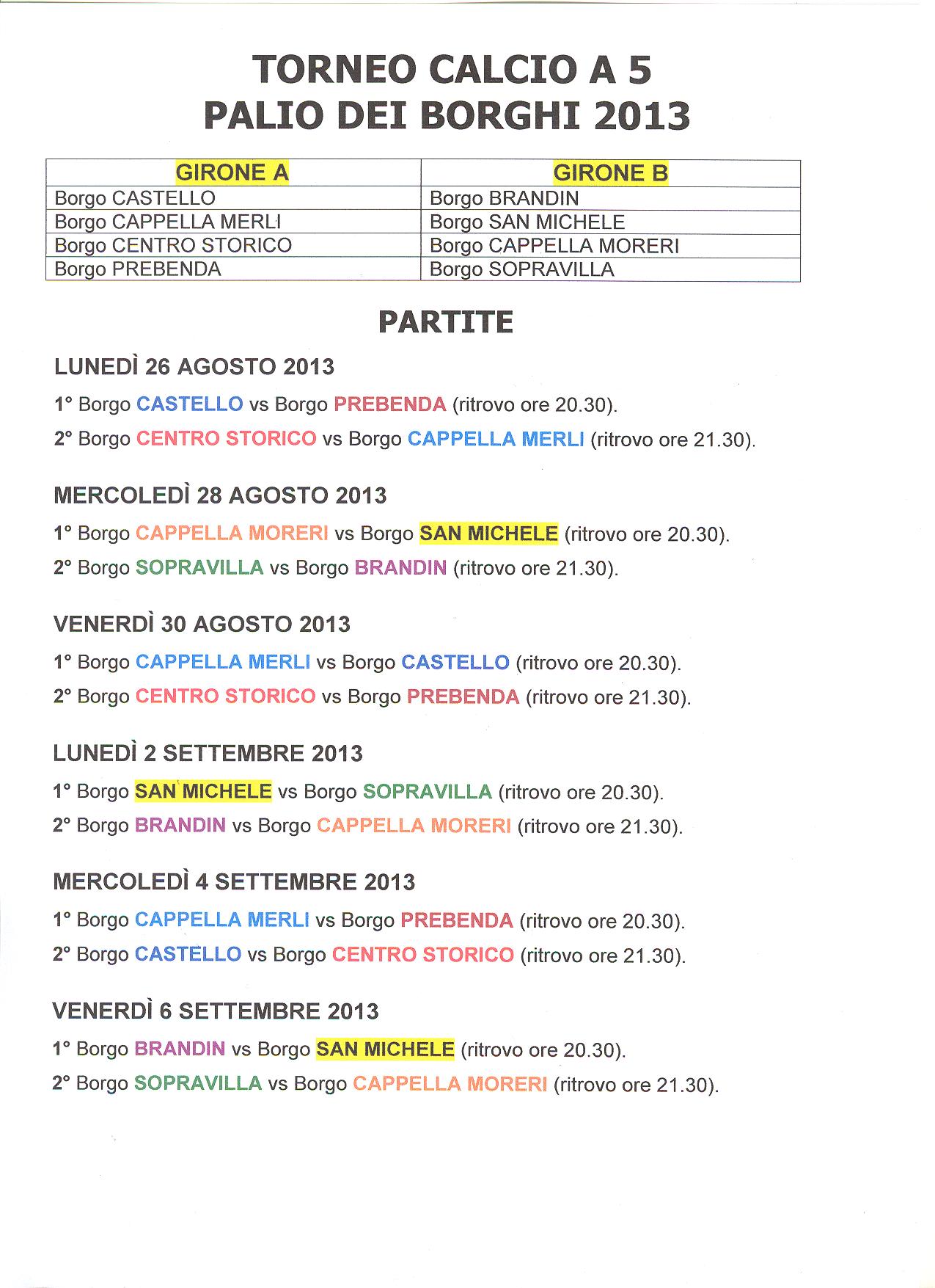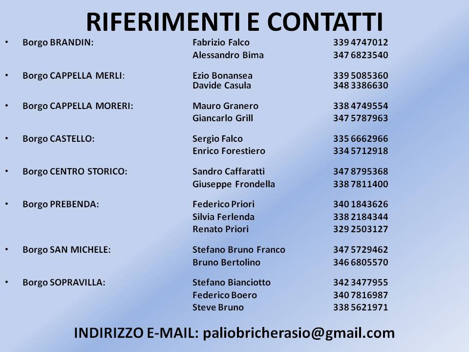 Giovedì 27 giugno è stato presentato a Bricherasio il Palio dei Borghi 2013 organizzato dalla neonata Associazione Palio dei Borghi in collaborazione con il Comune. Il Palio, nato dalla Corsa delle botti poi l’anno scorso sono stati aggiunti il calcio a 5, le bocce, la corsa e l’addobbo del borgo per la prima edizione bricherasiese. Per quest’anno sono stati aggiunti il Torneo di Carte, Tennis, Beach Volley, Staffetta Mountain Bike e Mini-Olimpiadi per il coinvolgimento di tutta la popolazione. Lunedì 26 agosto si parte per oltre 1 mese di gare tra gli otto borghi bricherasiesi che si sfideranno in nove competizioni e terminerà sabato 5 ottobre con il Gran Cenone.