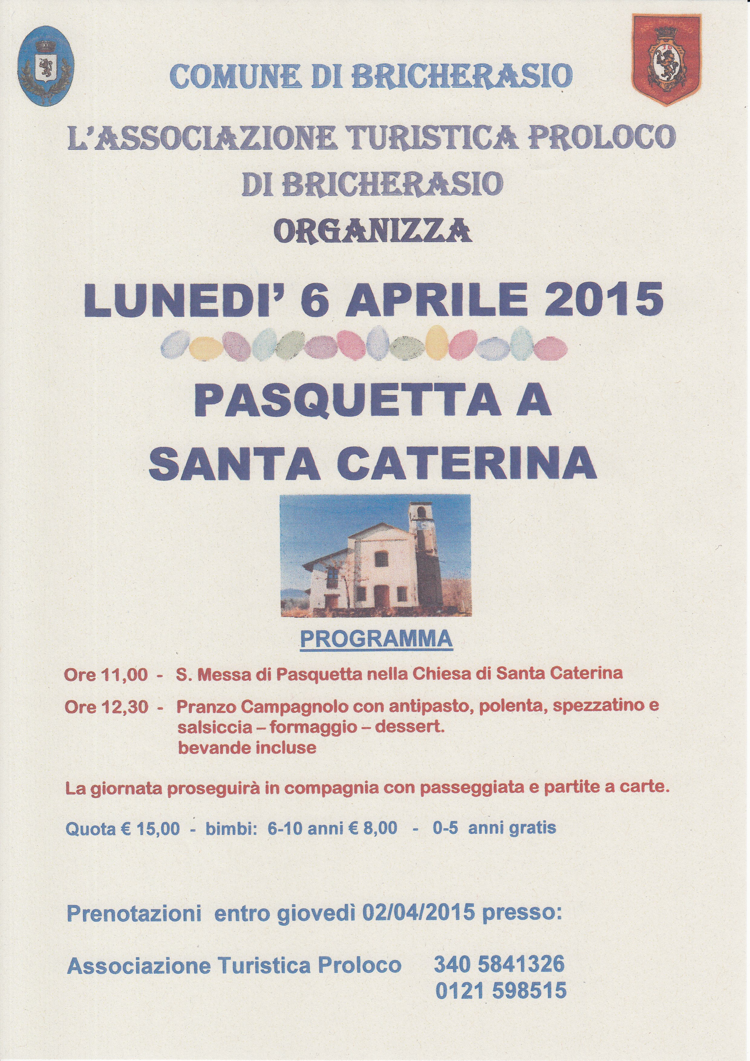 Il Comune di Bricherasio e l’Associazione Turistica Pro Loco organizzano per lunedì 6 aprile l’immancabile e consolidata nel calendario manifestazioni bricherasiese “Pasquetta a Santa Caterina”. Per riprendere la vecchia tradizione della gita fuori porta nel giorno di Pasquetta si organizza una grande polentata con spezzatino e salciccia nella tensostruttura che viene montata sul piazzale della bella chiesetta di Santa Caterina sulla collina di Bricherasio. Il programma prevede alle ore 11,00 la Santa Messa di Pasquetta nella Chiesa di Santa Caterina ed alle ore 12,30 il pranzo campagnolo con antipasto, polenta, spezzatino e salsiccia, formaggio e dessert al modico prezzo di € 15,00, bevande incluse. La giornata proseguirà in compagnia con passeggiate e partite a carte. Prenotazioni entro giovedì 2 aprile presso l’Associazione Pro Loco ai numeri 0121/598515 e 340/5841326.
