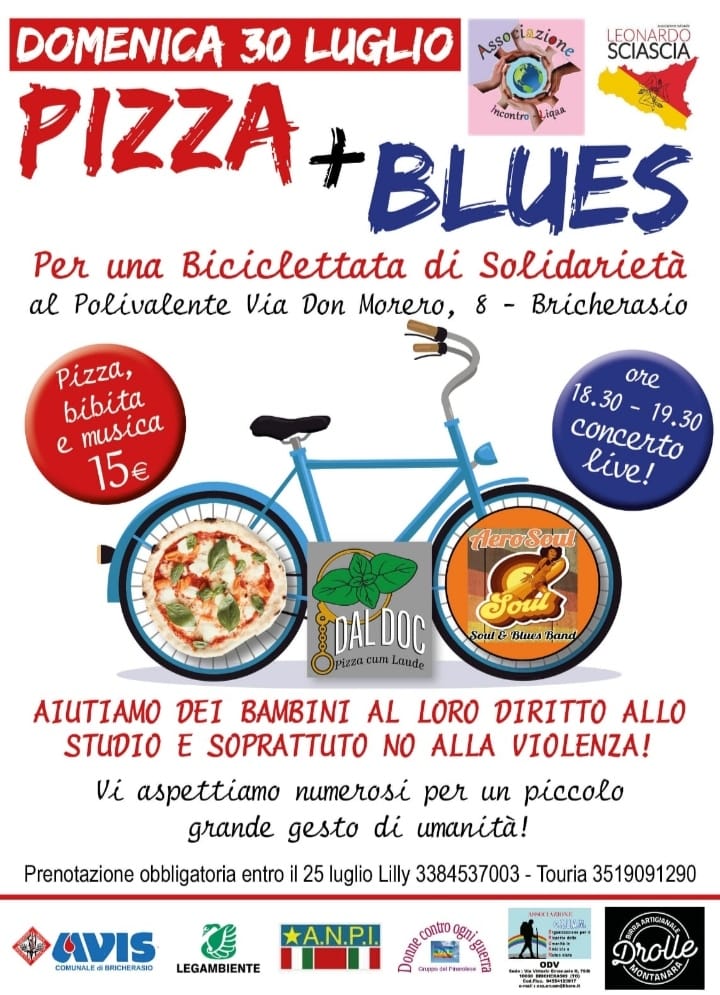 L’Associazione Leonardo Sciascia di Bricherasio, dalla sua nascita sempre vicina alle fasce più deboli, per aiutare i bambini al loro diritto allo studio e per rimarcare il proprio no alla violenza sulle donne invita tutti a partecipare alla serata Pizza & Blues prevista Domenica 30 luglio nel Salone Polivalente di Piazza Don Morero, 4 a Bricherasio a partire dalle ore 18,30. L’appuntamento, organizzato in collaborazione con l’Associazione Incontro Liqaa, Avis di Bricherasio, Legambiente, Oruam, Birrificio Drolle e Pizzeria Dal Doc che fornisce le pizze per la cena, serve a raccogliere fondi per dotare di biciclette bimbi e soprattutto bimbe dell’Africa vittime di stupri e violenze nel tragitto per recarsi a scuola. Il costo di partecipazione per pizza, bibita e musica live è fissato a 15 € ed è obbligatoria la prenotazione entro martedì 25 luglio telefonando a Lilly al 338/4537003 oppure Touria al 351/9091290.