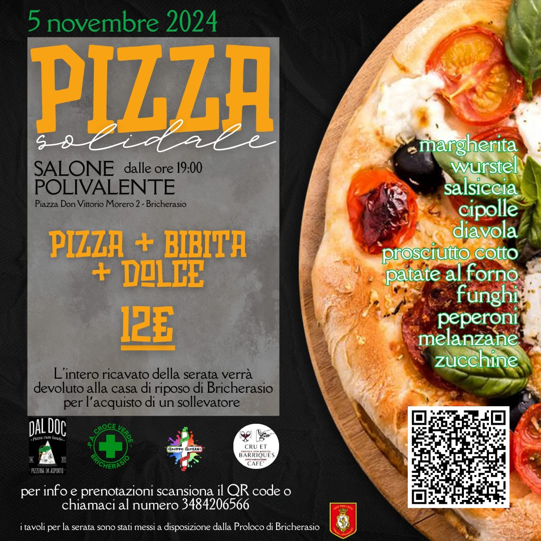 La Croce Verde di Bricherasio, con la collaborazione della Pizzeria Dal Doc e la vineria Cru et Barriques, organizza per le ore 19 di martedì 5 novembre al Salone Polivalente (Piazza Don Morero, 4) una serata a favore della Casa di Riposo di Bricherasio per l’acquisto di un sollevatore. L’evento denominato, come sempre, “Pizza solidale” gli scorsi anni ha aiutato tante persone in difficoltà, causa del periodo di crisi, con offerta libera di minimo 12 € che prevede pizza, bibita e dolce. Le pizze si potranno scegliere tra le undici proposte. Prenotazioni obbligatorie da Martina al 348/4206566 oppure Diego al numero 366/5775758.