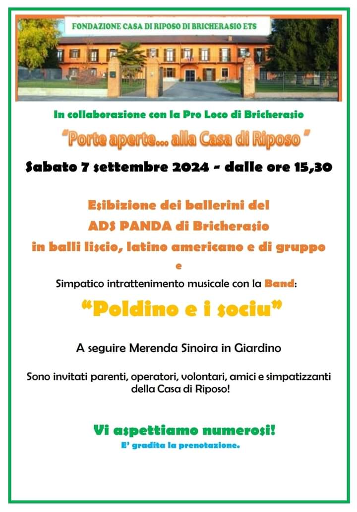 All’interno delle manifestazioni della 56^ Sagra dell’Uva ci sono le classiche Porte aperte alla casa di riposo di Bricherasio alle ore 15,30 di sabato 7 settembre, con animazione per allietare il soggiorno degli ospiti, parenti, volontari, amici e simpatizzanti. E' previsto un simpatico intrattenimento musicale a cura di “Poldino e I sociu” al quale faranno seguito l’esibizione di coppie di ballerini dell’Associazione Sportiva Panda con balli liscio, latino americano e di gruppo prima della merenda sinoira nel giardino della struttura sita in Via Bell Ville. Gradita la prenotazione al numero 012159137.