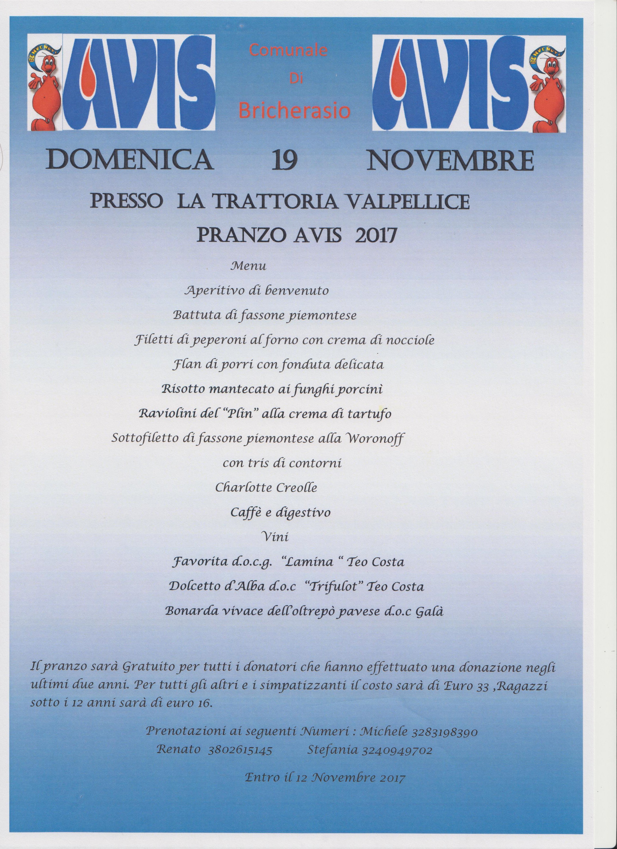 Prenotazioni aperte per il pranzo sociale dell’AVIS di Bricherasio, fissato per Domenica 19 novembre alla Trattoria Valpellice di San Secondo di Pinerolo. Appuntamento fissato alle 12,30 sul posto per i festeggiamenti di un altro anno di volontariato e di donazioni a favore di chi è più bisognoso. Durante il convivio verranno premiati i donatori benemeriti. Il costo per familiari e simpatizzanti è di 33 € mentre ci sono sconti per i ragazzi sotto i 12 anni che pagano 16 € ed è gratis sia per i più piccoli sia per chi ha effettuato almeno una donazione negli ultimi due anni. Per prenotazioni rivolgersi a Michele allo 328/3198390, a Stefania al 324/0949702 oppure a Renato 380/2615145.