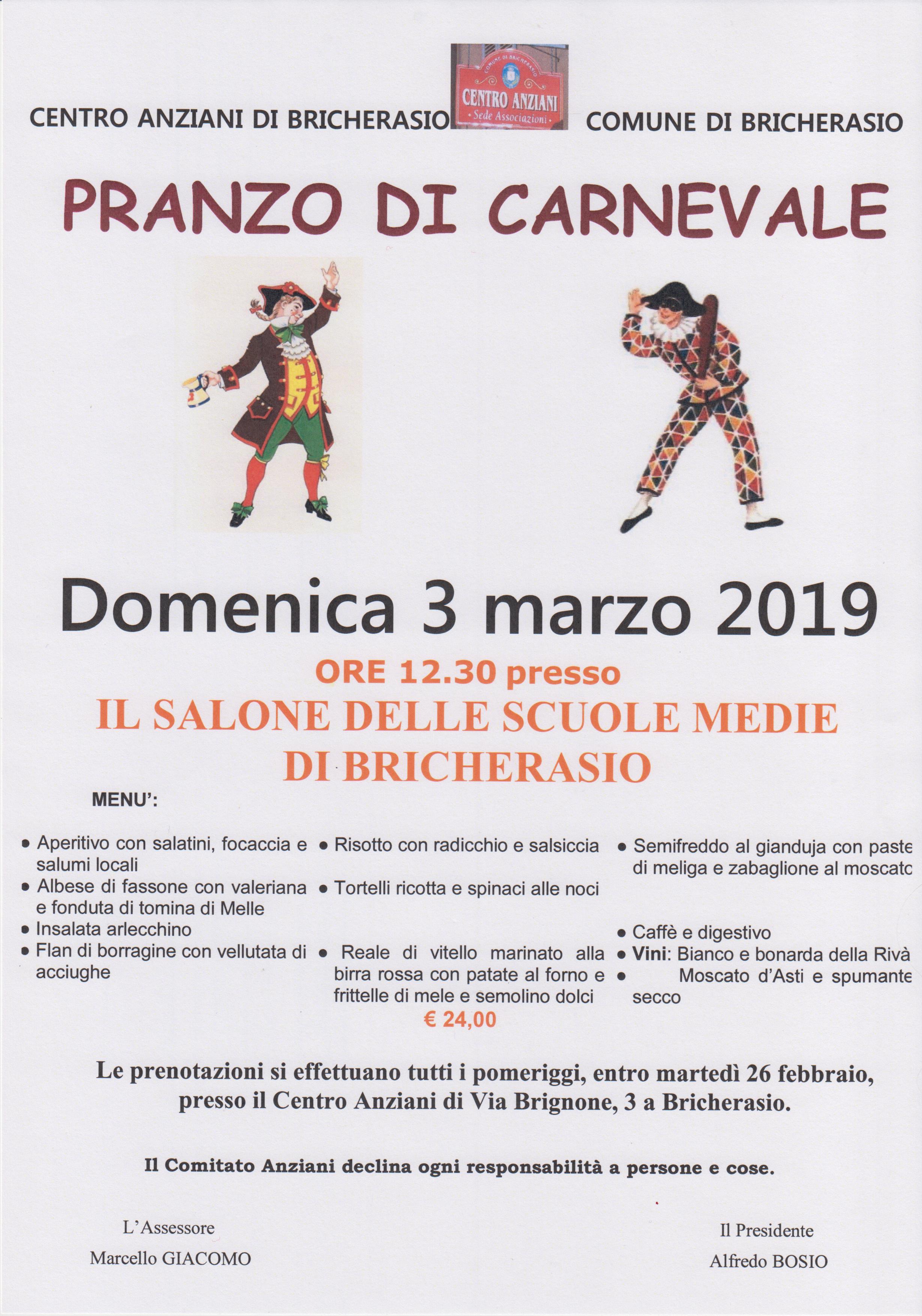 Il Centro Anziani di Bricherasio in collaborazione con il Comune organizza per Domenica 3 marzo alle ore 12,30 l'immancabile pranzo di Carnevale nel Salone delle Scuole Medie di Bricherasio. Previsto un ricco menù composto, dopo l’aperitivo con salatini focaccia e salumi locali, da Albese di fassone con valeriana e fonduta di tomina di Melle, Insalata arlecchino e Flan di borragine con vellutata di acciughe. I primi sono Risotto con radicchio e salsiccia e Tortelli ricotta e spinaci alle noci, il secondo piatto è Reale di vitello marinato alla birra rossa con patate al forno e frittelle di mele e semolino dolci. Il dolce è il Semifreddo al gianduja con paste di meliga e zabaglione al moscato poi caffè e digestivo il tutto annaffiato da vino Bianco e bonarda della Rivà, dal Moscato d’Asti e spumante secco a 24 €. Per informazioni e prenotazioni rivolgersi, tutti i giorni, dalle ore 15.00 alle 18.00, presso il Centro Anziani di Via Brignone, 3 a Bricherasio (entro martedì 26 febbraio).