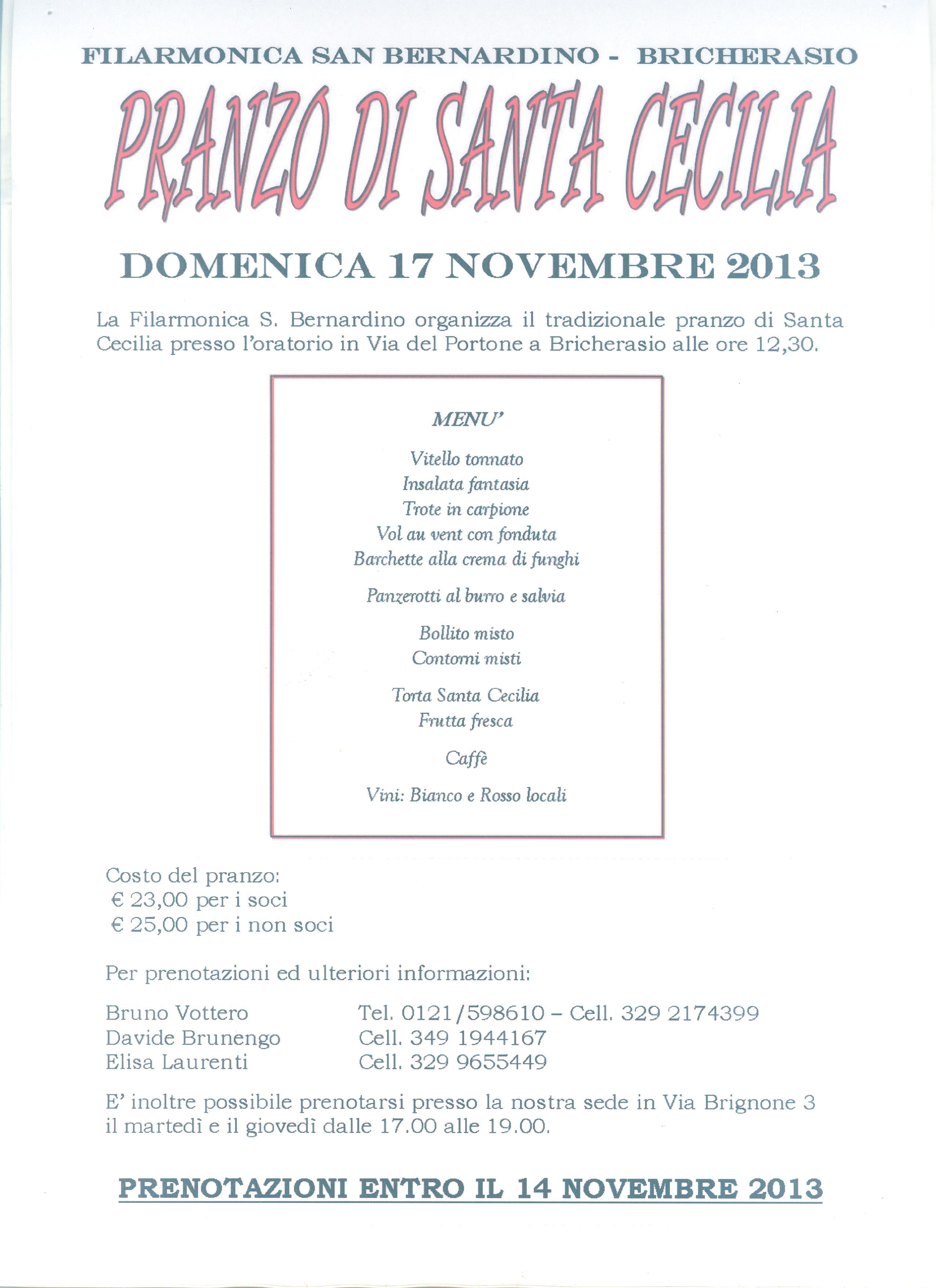 La Filarmonica San Bernardino di Bricherasio organizza per Domenica 17 novembre il tradizionale pranzo di “Santa Cecilia”, patrona della musica. Nel corso della mattinata la Banda partecipa alla Santa Messa delle ore 10,30. Come da tradizione anche quest’anno l’appuntamento si svolge alle 12,30 presso l’Oratorio Parrocchiale di Via del Portone a Bricherasio. Per informazioni e prenotazioni rivolgersi entro giovedì 14 a Bruno Vottero, 0121/598610, a Davide Brunengo al 349/1944167 oppure a Elisa Laurenti al n. 329/9655449. Inoltre è possibile prenotarsi presso la sede della banda in Via Brignone, 3 il martedì e il giovedì dalle 17 alle 19.