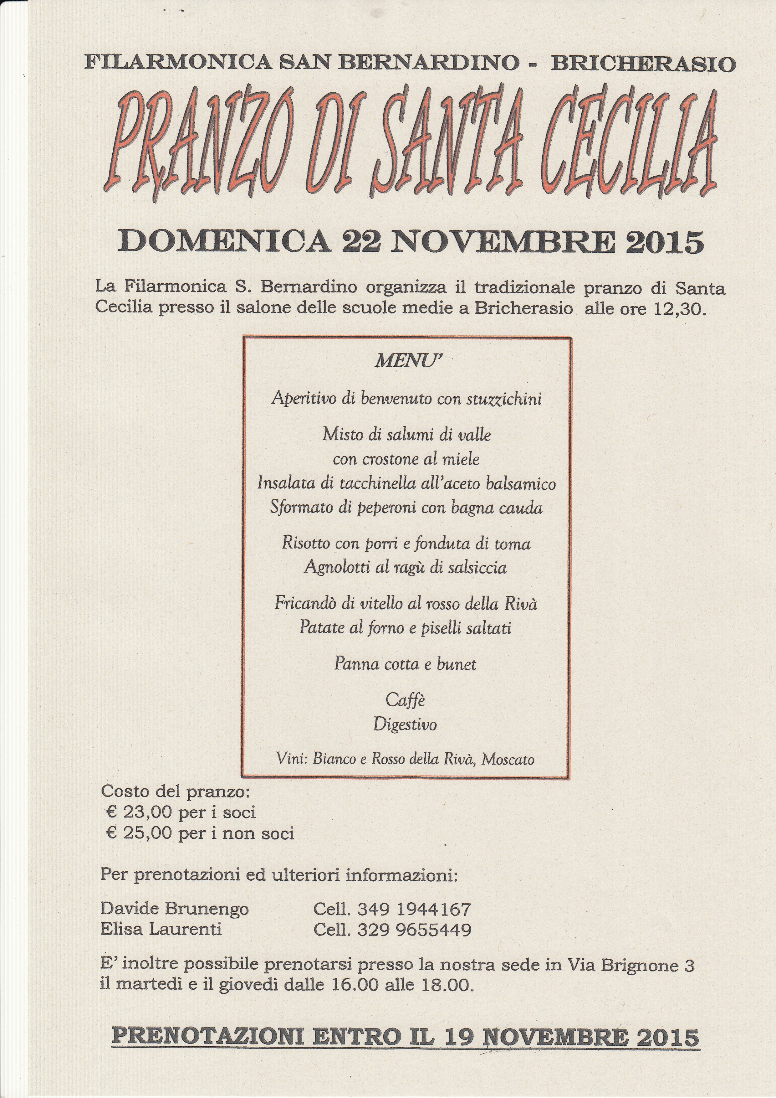 La Filarmonica San Bernardino di Bricherasio organizza per Domenica 22 novembre il tradizionale pranzo di “Santa Cecilia”, patrona della musica. Quest’anno l’appuntamento si svolge alle 12,30 presso il salone delle Scuole Medie a Bricherasio. Il costo del convivio è fissato in 23,00 € per i soci e in € 25,00 per coloro sprovvisti di tessera. Per ulteriori informazioni e prenotazioni entro giovedì 19 novembre rivolgersi a Davide Brunengo al 349/1944167 oppure a Elisa Laurenti al n. 329/9655449. Inoltre è possibile prenotarsi presso la sede della banda in Via Brignone, 3 il martedì e il giovedì dalle 16 alle 18.