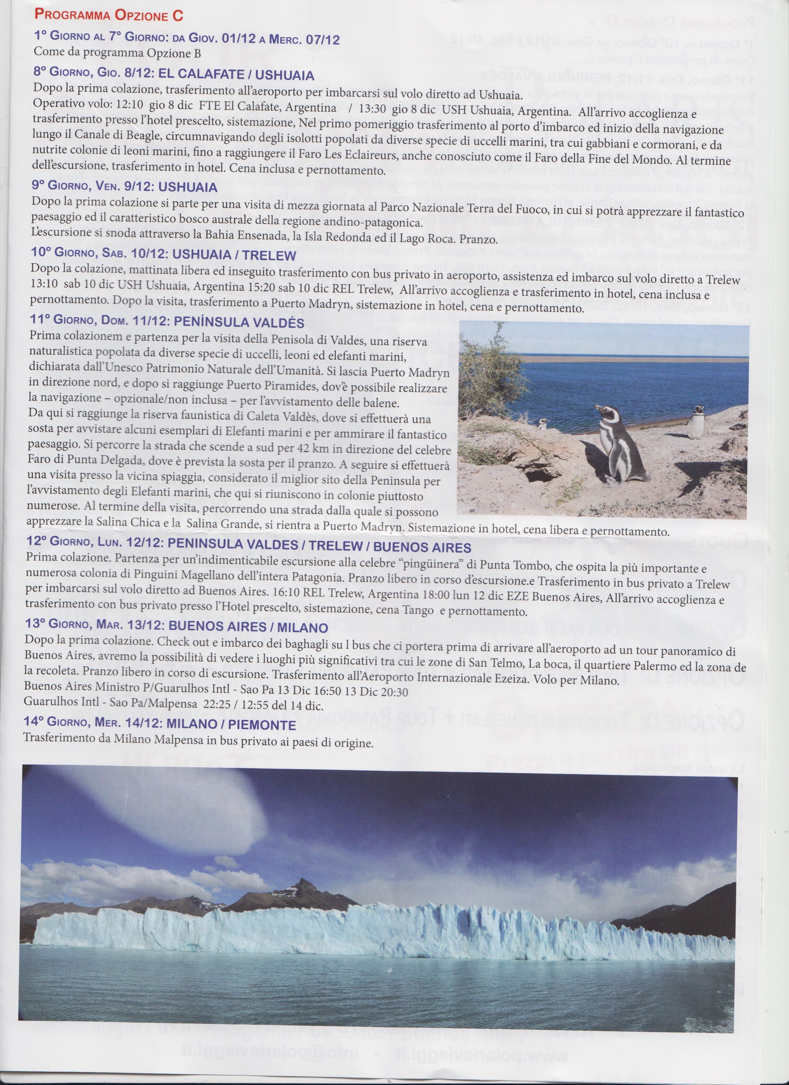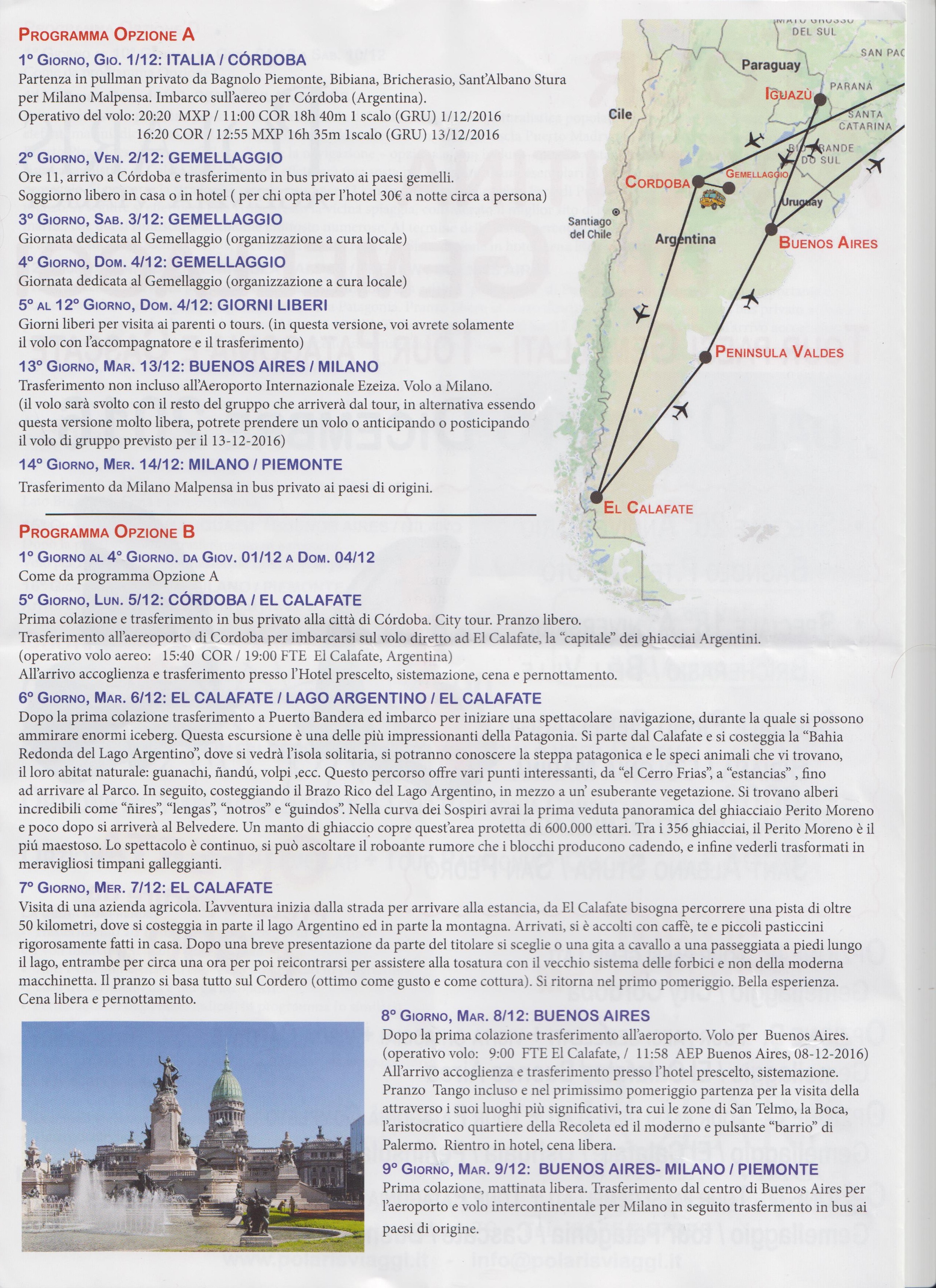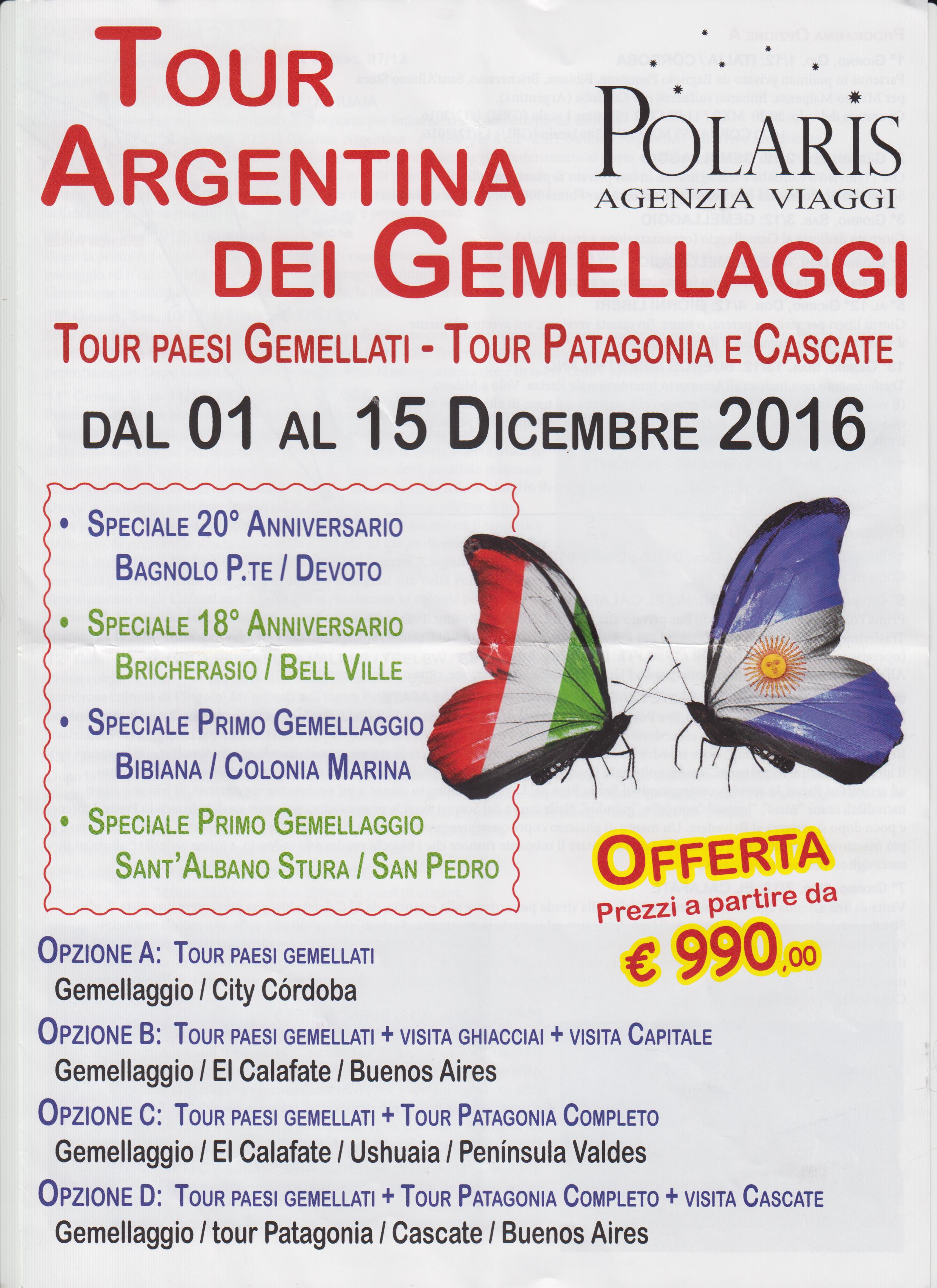 In occasione del 20° anniversario del gemellaggio tra Bagnolo Piemonte e Devoto, del 18° tra Bricherasio e Bell Ville e del 1° gemellaggio tra i paesi di Bibiana con Colonia Marina e di Sant'Albano di Stura con San Pedro. Le quote individuali di partecipazione variano da 990 € a 3550 € a seconda del tour scelto se la prenotazione viene effettuata entro martedì 30 agosto. Quattro le opzioni di viaggio proposte: il tour dei paesi gemellati costa 990 € per un soggiorno di 14 giorni e comprende il volo da Milano Malpensa a Cordoba, 3 giorni dedicati ai vari gemellaggi, una settimana libera, il rientro da Buenos Aires e il trasferimento nei paesi di provenienza. La seconda costa 1900 € dura 9 giorni e fino al quarto giorno ricalca la precedente, dal successivo si vola ad El Calafate, la "capitale" dei ghiacciai Argentini con una spettacolare navigazione per ammirare enormi iceberg, la steppa patagonica e le speci animali nel loro habitat naturale. L'ultimo giorno si và nella capitale Buenos Aires per una visita della città attraverso i suoi luoghi più significativi. Martedì 9 dicembre volo intercontinentale per Milano. La terza opzione di 14 giorni comprende un tour della Patagonia a partire dall'ottavo giorno, la prima settimana è uguale all'opzione precedente e prima della visita a Buenos Aires escursioni a Ushuaia al Parco Nazionale Terra del Fuoco, alla riserva naturalistica della Penisola di Valdes ed al faro di Punta Delgada. Prima di imbarcarsi per il rientro in Italia giornata da trascorrere nella capitale argentina. Il tutto a 3000 €. L’ultima variante di viaggio dura 16 giorni per un costo di 3550 € e dopo Buenos Aires si visita il Parco Nazionale delle cascate di Iguazu prima dal lato argentino e il giorno seguente da quello brasiliano. Informazioni e prenotazioni all'Agenzia Viaggi Polaris di Bagnolo Piemonte al numero 0175/48424