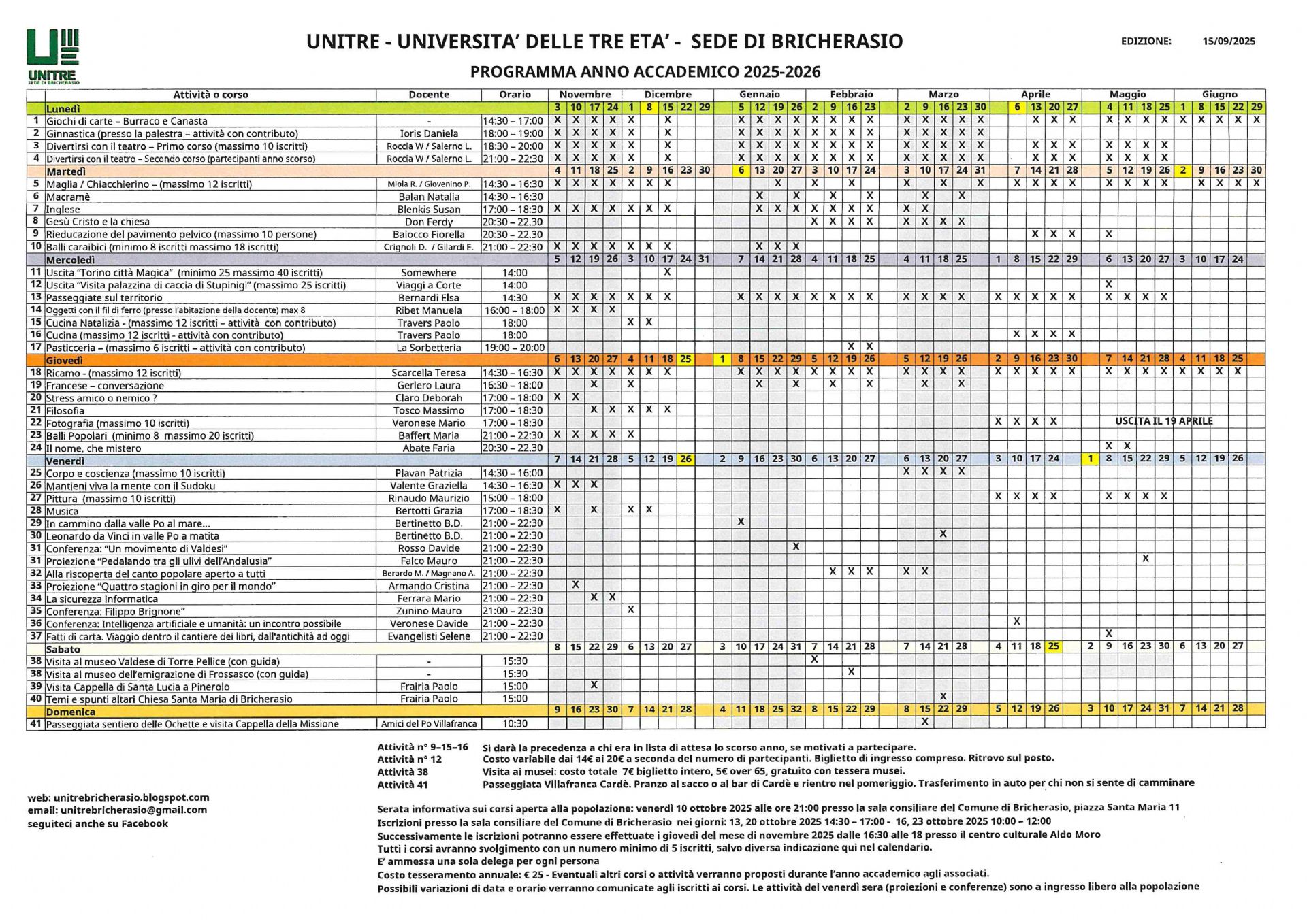 La presentazione dei corsi del 25^ anno accademico 2025/26 dell’Unitre di Bricherasio è prevista per venerdì 10 ottobre alle ore 21 nella sala Consiliare del Comune di Bricherasio, in Piazza Santa Maria 11 e le iscrizioni si effettuano nel medesimo luogo i lunedì 13 e 20 ottobre dalle ore 14,30 alle 17 e i giovedì 16 e 23 ottobre dalle ore 10 alle 12. Successivamente le iscrizioni potranno essere effettuate i giovedì del mese di novembre dalle 16,30 alle 18 al Centro Culturale “Aldo Moro” di Via Vittorio Emanuele II, 79/B dove si svolge gran parte dell’attività. Il costo del tesseramento annuale è invariato a € 25 ed eventuali altri corsi o attività verranno proposti durante l’anno accademico agli associati. Le attività del venerdì sera (proiezioni e conferenze) sono a ingresso libero alla popolazione e possibili variazioni di data e orario verranno comunicate agli iscritti ai corsi.