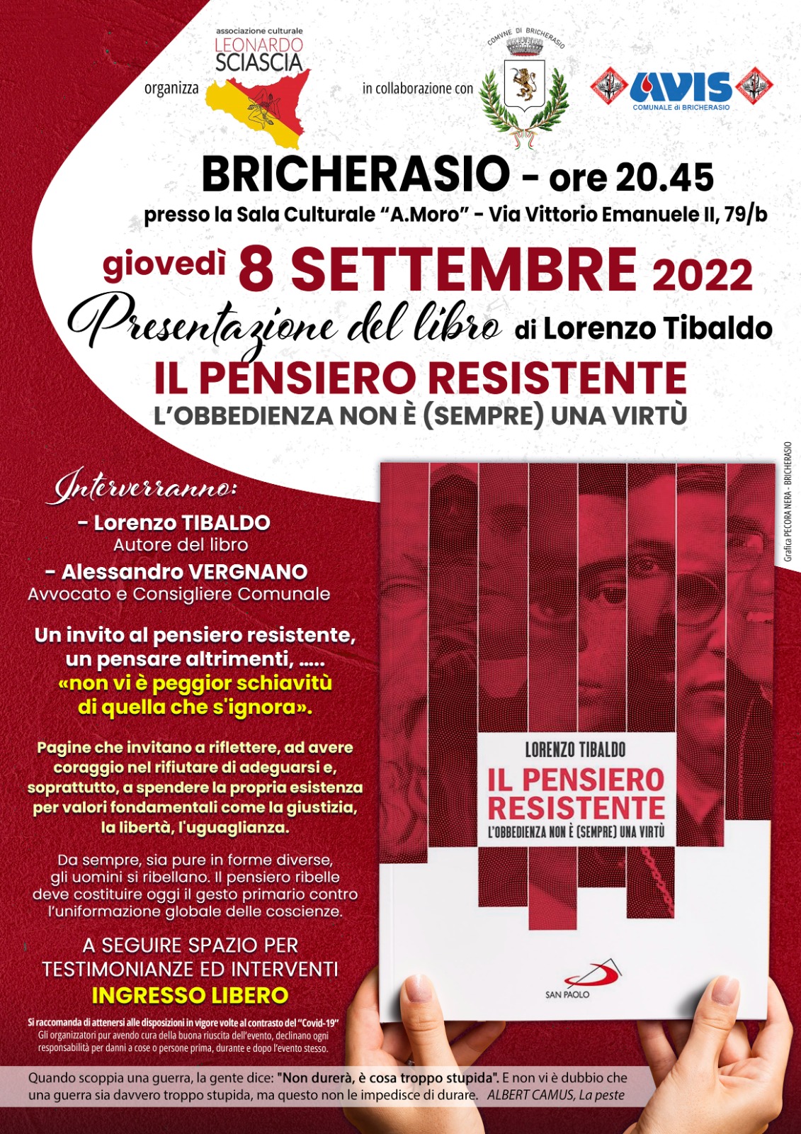 L’Associazione culturale Leonardo Sciascia di Bricherasio in collaborazione con il Comune e l’Avis locale propongono, all’interno della Sagra dell’Uva bricherasiese, per giovedì 8 settembre alle ore 20,45 alla Sala Culturale Aldo Moro, in Via Vittorio Emanuele II, 79/B ad ingresso libero, la presentazione del libro di Lorenzo Tibaldo “Il pensiero resistente. L'obbedienza non è (sempre) una virtù” con l’intervento dell’autore e del consigliere comunale l’Avvocato Alessandro Vergnano.