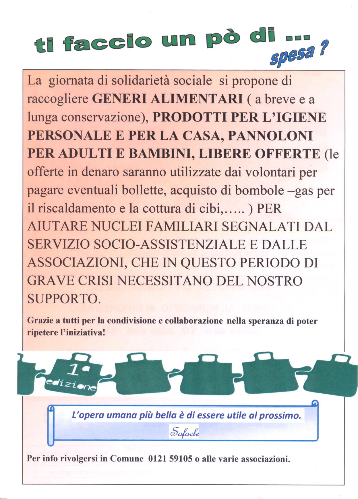 Iniziativa dell'Assessorato delle Politiche Sociali e delle Associazioni locali : sabato 27 ottobre dalle 10.00 alle 18.00 si possono consegnare ai volontari delle associazioni offerte di generi alimentari a breve e a lunga scadenza, prodotti per l'igiene personale e per la casa, pannolini per bambini e pannoloni per adulti, libere offerte (anche in denaro) che veranno poi utilizzate per aiutare nuclei familiati segnalati dal servizio socio- assistenziali e dalle associazioni