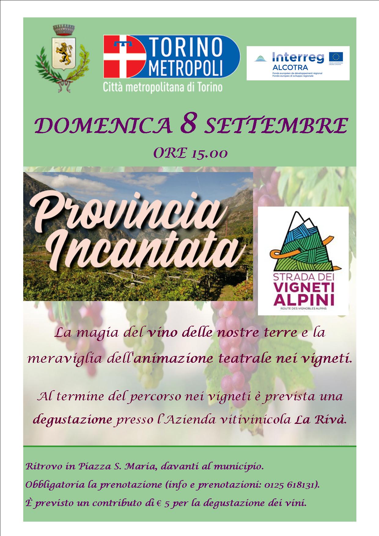PROVINCIA INCANTATA – Strada dei Vigneti Alpini, a cura della Città Metropolitana, rientrante nel cartellone eventi della 51^ Sagra dell’Uva, dalle ore 15.00 la magia del vino delle nostre terre e la meraviglia dell'animazione teatrale nei vigneti. Al termine del percorso nei vigneti è prevista una degustazione presso l’Azienda vitivinicola La Rivà. Obbligatoria la prenotazione (info e prenotazioni: 0125 618131).