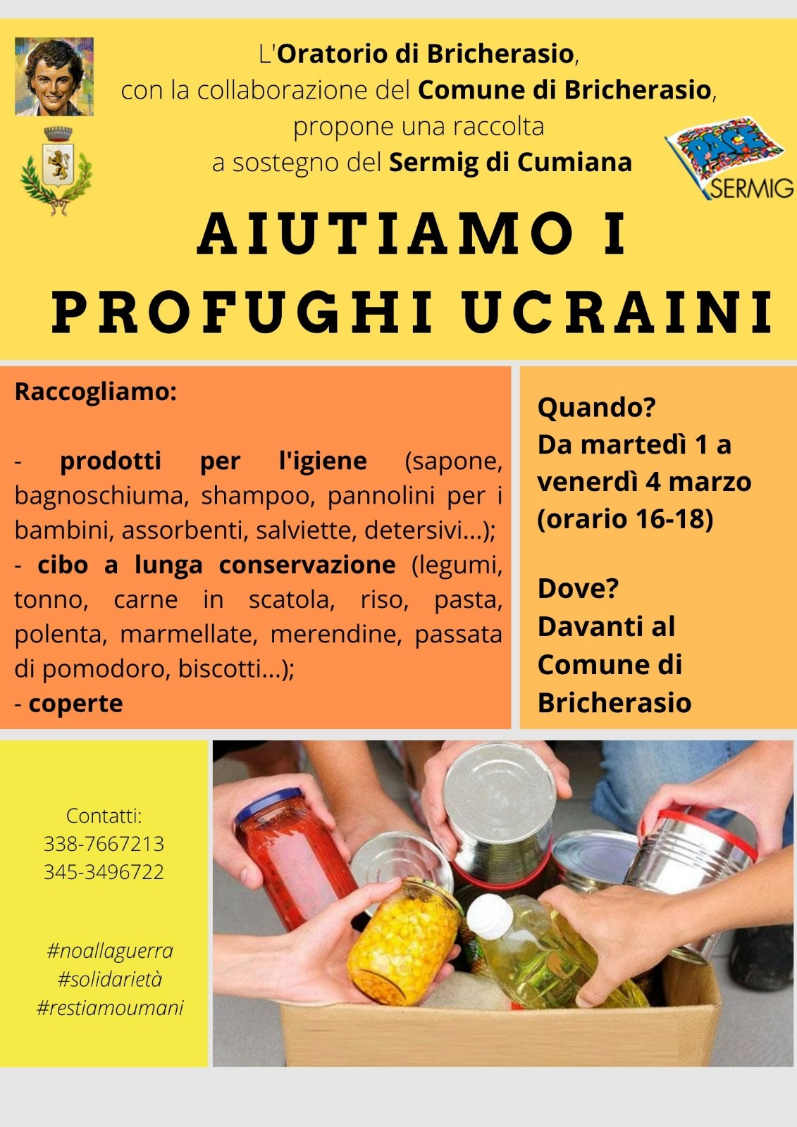 L'Oratorio San Domenico Savio di Bricherasio in collaborazione con il Comune propone una raccolta a sostegno del Sermig per aiutare i profughi ucraini in Romania. Da martedì 1 a venerdì 4 marzo dalle ore 16 alle 18 davanti al Municipio bricherasiese si possono donare prodotti per l'igiene, cibo a lunga conservazione e coperte. Per ulteriori informazioni telefonare ai numeri 338/7667213 oppure 345/3496722.