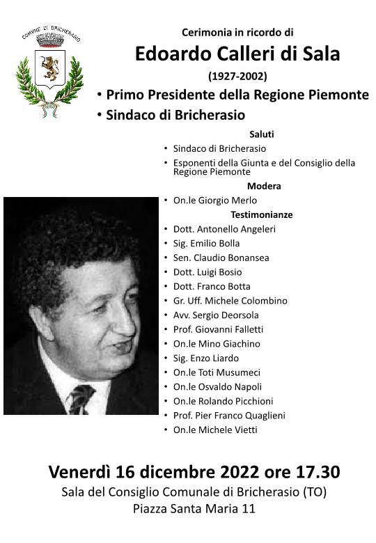 Venerdì 16 dicembre alle 17 nella Sala Consiliare del Comune momento toccante con la cerimonia in ricordo di Edoardo Calleri di Sala nel ventesimo anniversario della scomparsa. Il Conte Calleri è stato dal 1951 al 1960 Sindaco di Bricherasio e dal 1970 al 1973 il primo presidente della Regione Piemonte ed esponente di spicco della Democrazia Cristiana a livello regionale e nazionale, Presidente della Cassa di Risparmio di Torino e di Italcasse. Portano la loro testimonianza molti amici e compagni dell'avventura politica ed imprenditoriale del Conte e l’incontro è moderato dall’Onorevole Giorgio Merlo.
