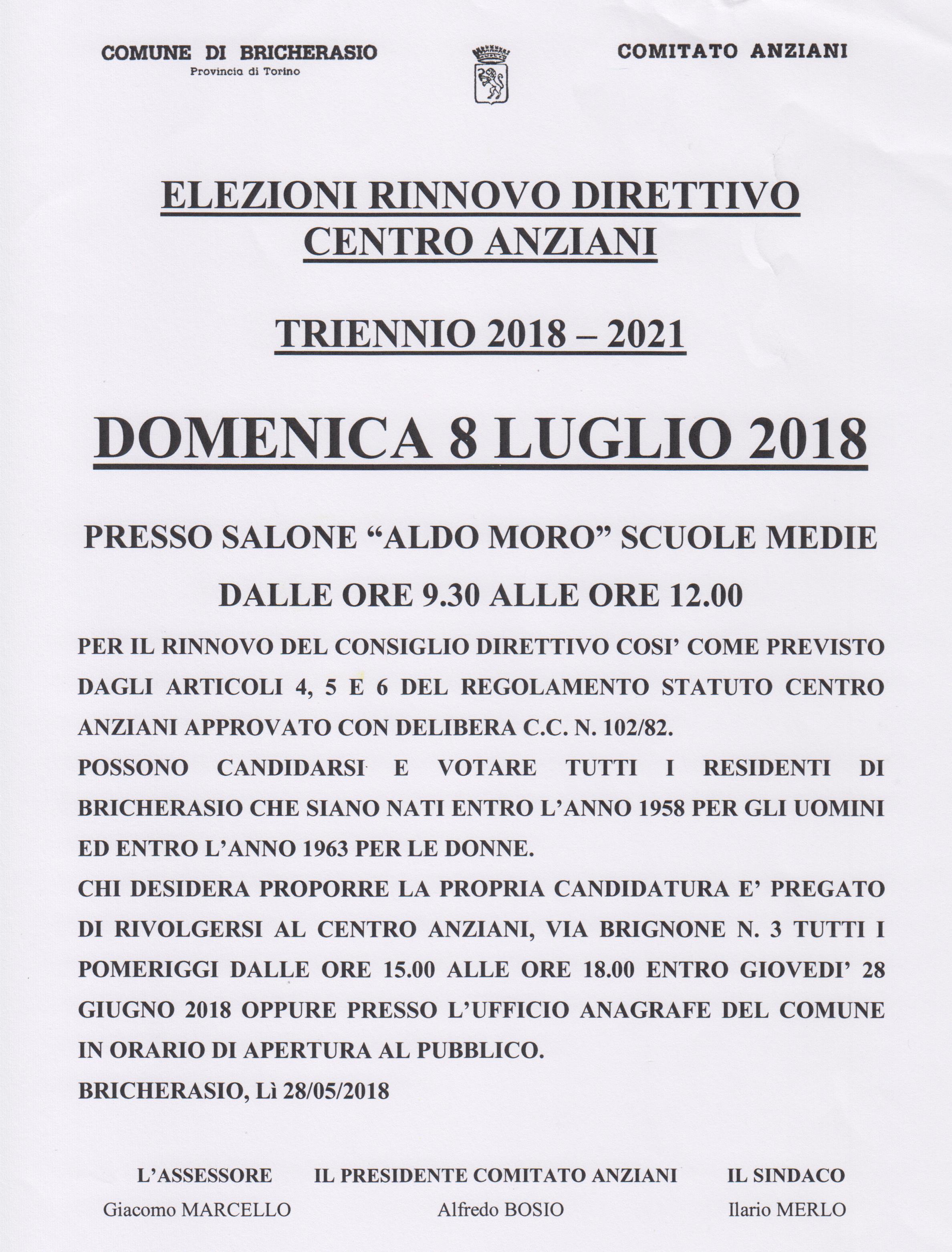 Il Centro Anziani di Bricherasio rinnova il proprio Consiglio Direttivo per il triennio 2018-2021. Le elezioni sono in programma per Domenica 8 luglio dalle ore 9,30 alle 12,00 al Centro Culturale “Aldo Moro” DI Via Vittorio Emanuele II, 79/B. Per candidarsi rivolgersi entro giovedì 28 giugno al Centro Anziani di Via Brignone, 3 a Bricherasio tutti i pomeriggi dalle ore 15,00 alle 18,00 oppure presso l’Ufficio Anagrafe del Comune bricherasiese. Possono candidarsi e votare tutti i residenti di Bricherasio che siano nati entro l’anno 1958 per gli uomini ed entro il 1963 per le donne.