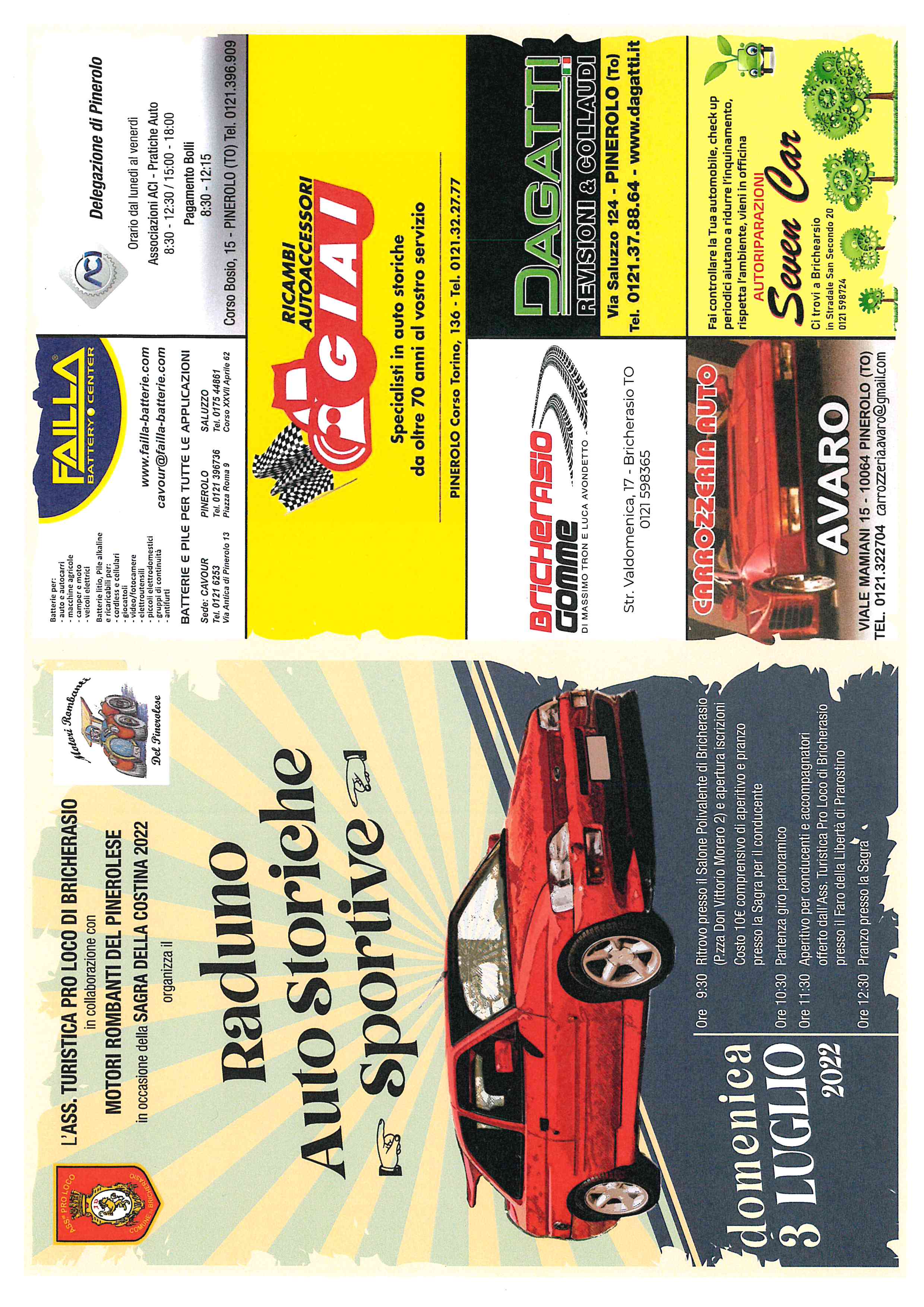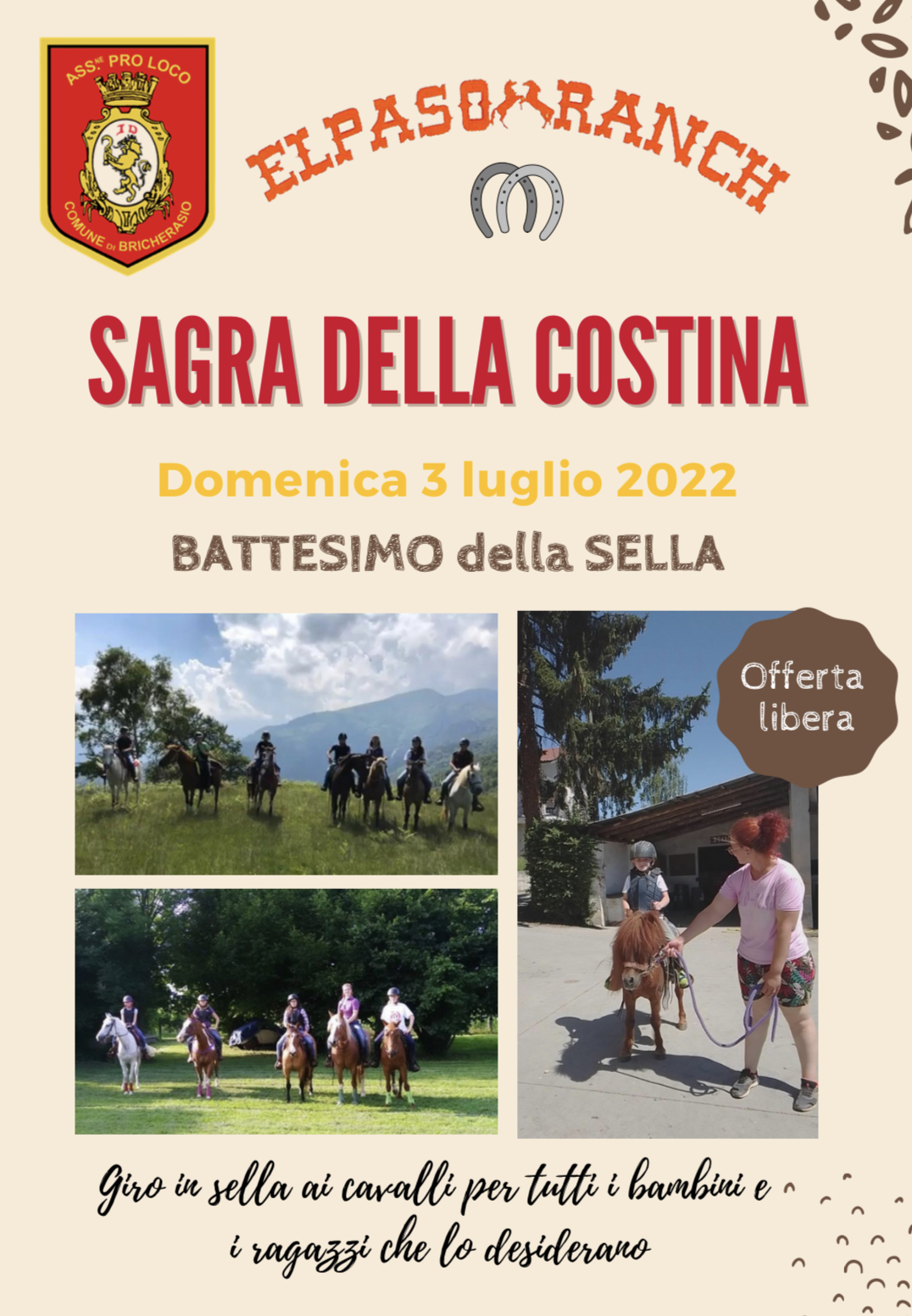 L’Associazione Turistica Pro Loco di Bricherasio organizza per sabato 2, domenica 3, lunedì 4 e martedì 5 luglio presso la sede di Piazza Vittorio Morero 4 la tradizionale “Sagra della costina”, giunta a quasi cinquanta edizioni e, causa Covid, spostata da alcune edizioni da Cappella Moreri, storica location che negli anni ha fatto diventare la manifestazione la più importante dell’Associazione bricherasiese. Centinaia di persone coinvolte per quattro giornate, durante le quali si cuociono montagne di costine, patatine, agnolotti, antipasti vari, dolci, e alla sera quattro salti sul ballo a palchetto con rinomate orchestre.