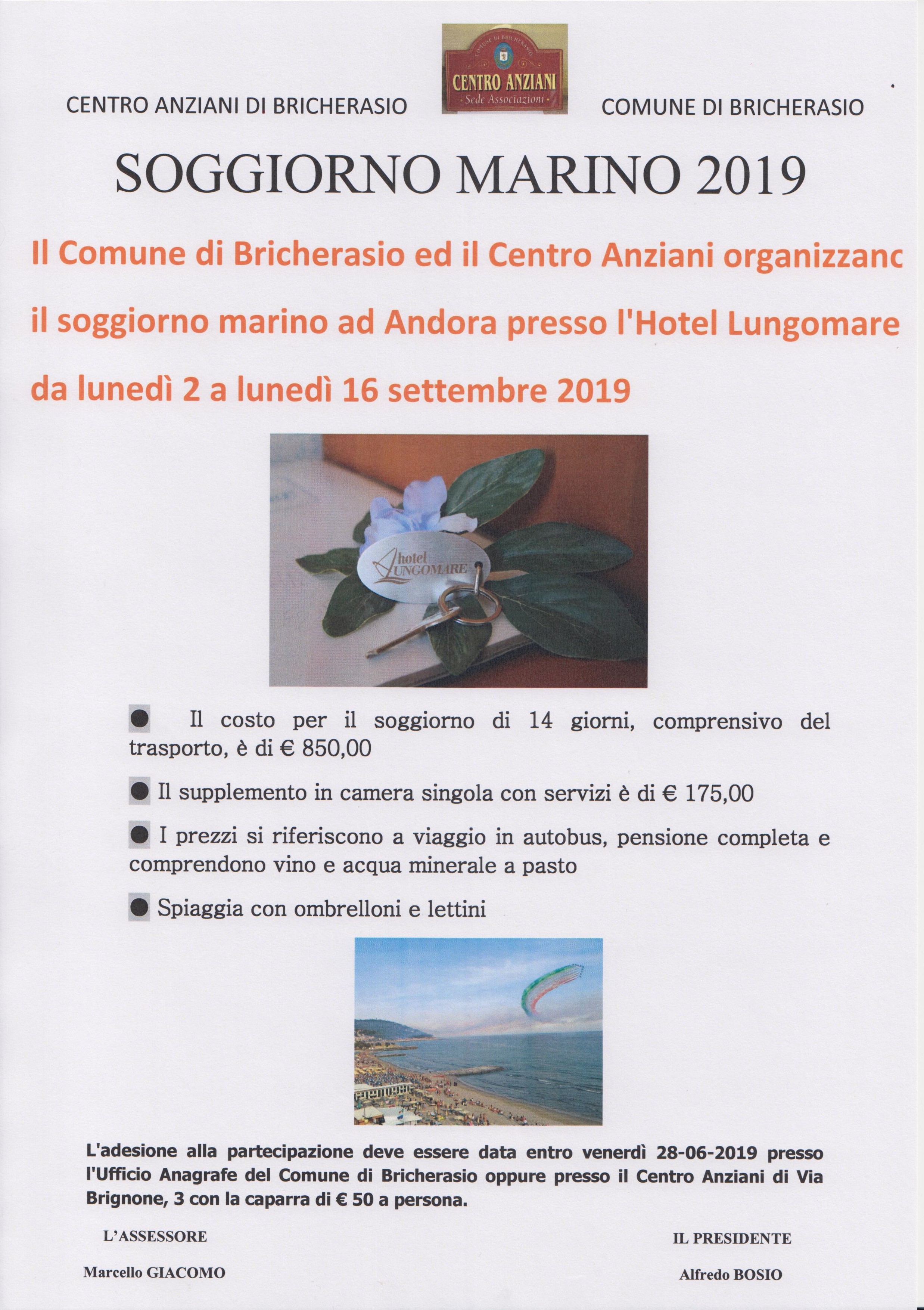 Il Comune di Bricherasio e il Centro Anziani organizzano il consolidato soggiorno marino per anziani ad Andora presso l’Hotel Lungomare da lunedì 2 a lunedì 16 settembre. Il costo per il soggiorno di 14 giorni, comprensivo di trasporto in pullman, è di € 850,00. Il supplemento in camera singola con servizi è di € 175,00. I prezzi si riferiscono a pensione completa e comprendono, oltre al vino e acqua minerale nei pasti, anche la spiaggia con ombrellone e lettini. Informazioni presso l’Ufficio Anagrafe del Comune di Bricherasio, referente Sig.ra Lidia, con la caparra da versare di 50,00 €.