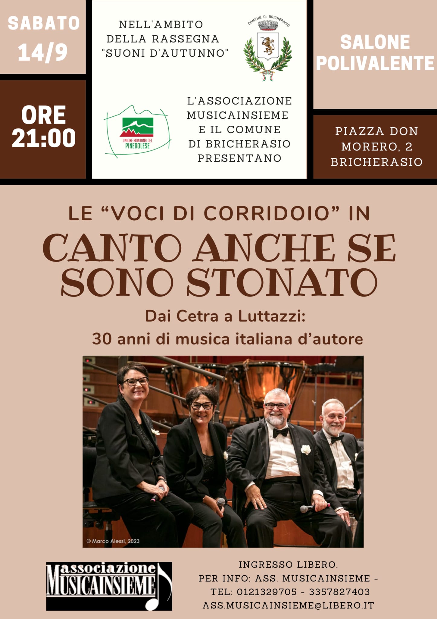 Il Comune di Bricherasio in collaborazione con l’Associazione Musicainsieme presentasabato 14 settembre alle ore 21.00 nell’ambito della Rassegna musicale intercomunale “Suoni d’autunno”, le “Voci di corridoio” che si esibiscono in "Canto anche se sono stonato". Nel salone Polivalente di Piazza Don Morero, 2 di Bricherasio ad ingresso libero si potranno ascoltare 30 anni di musica italiana d’autore dai Cetra a Luttazzi. Per maggiori informazioni: ass.musicainsieme@libero.it, 0121.329705 oppure 335.7827403.