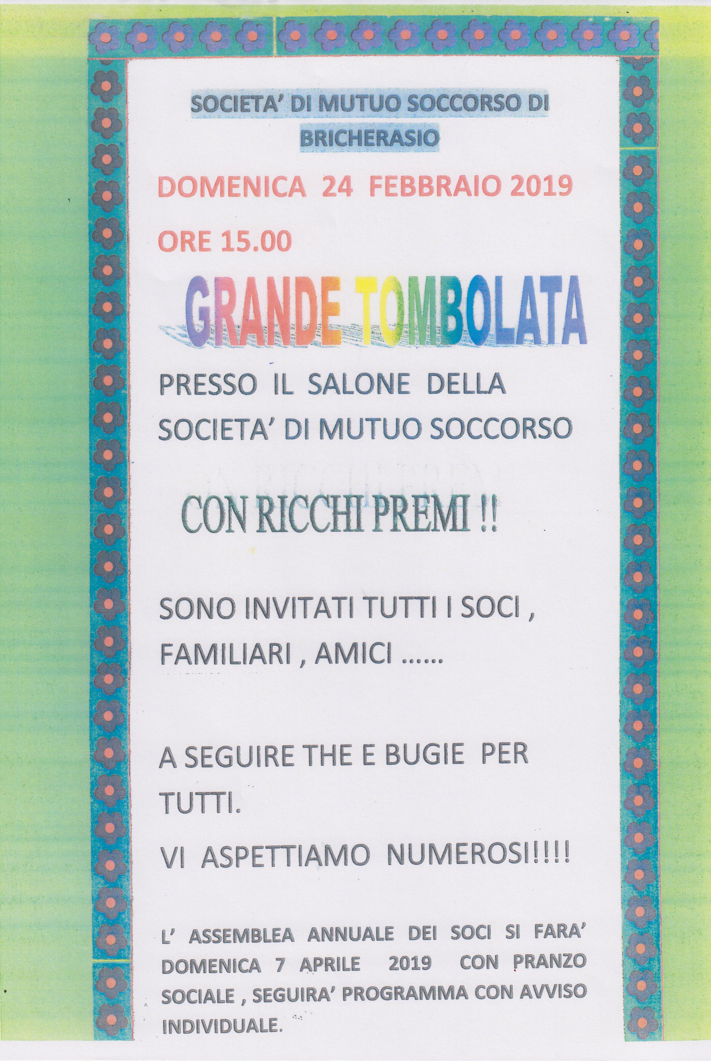 La Società di Mutuo Soccorso di Bricherasio organizza per Domenica 24 febbraio a partire dalle ore 15 nella propria sede in Via Brignone, 11 una grande tombolata con ricchi premi alla quale sono invitati tutti i soci, familiari e simpatizzanti. A seguire the e bugie per tutti coloro che interverranno. Inoltre l’Associazione Bricherasiese anticipa che Domenica 7 aprile si terrà l’assemblea annuale dei soci con il pranzo sociale. Attualmente il direttivo è composto dal Presidente Anita Ghirardi, dal vice Giacomo Marcello e dai consiglieri Piera Bruno Franco, Angelo Franzetti, Vito Latino, Gabriella Pons e Elda Rolfo con tre Revisori dei conti nelle figure di Giusto Cagliero, Antonio Fornero e Pier Amos Reale.