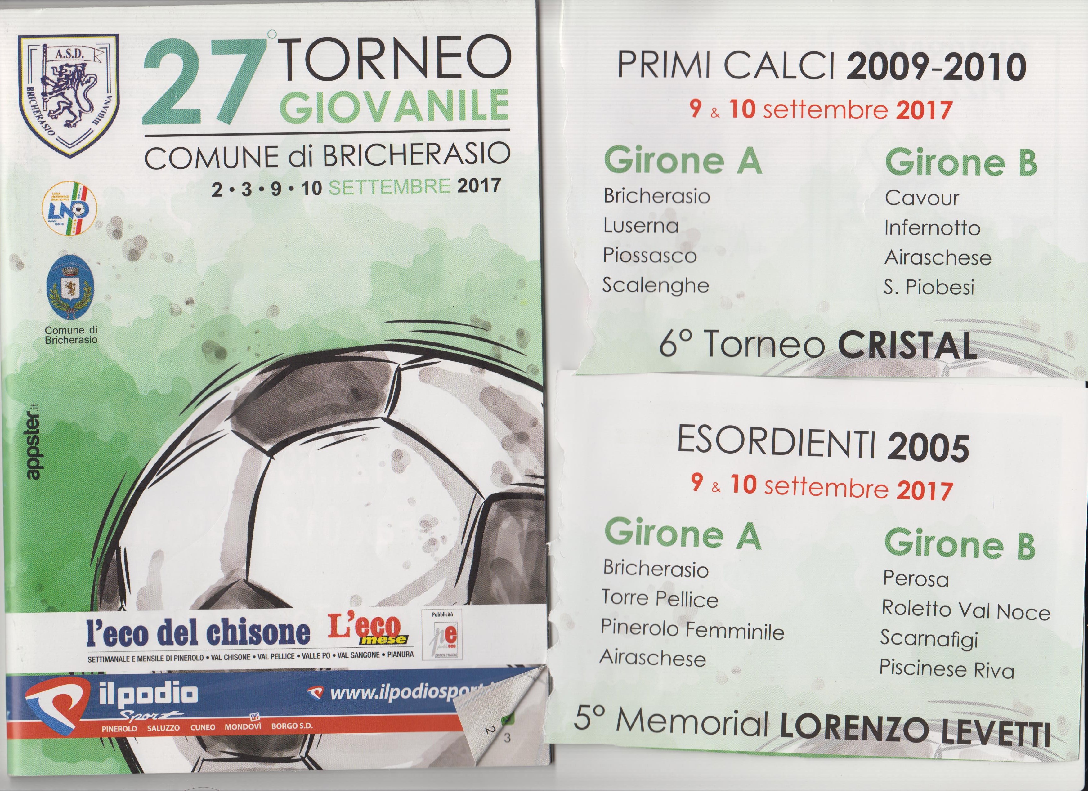 La società Bricherasio/Bibiana organizza la 27^ edizione del torneo di calcio “Comune di Bricherasio”. La società ha cambiato dirigenze, allenatori, presidenti e anche il nome ma l’entusiasmo al “Calleri di Sala” rimane invariato. Numeri sempre più importanti caratterizzano una manifestazione organizzata da ventisette anni dalla società Bricherasio/Bibiana, diventata un tradizionale ritrovo di giovani calciatori prima dell’inizio dei campionati ed inserisce la manifestazione nel programma della 49^ Sagra dell’Uva dove gli ingredienti essenziali sono entusiasmo e voglia di partecipare. Pure nel prossimo weekend, della kermesse di calcio giovanile, saranno presenti otto squadre per le due categorie in programma gli Esordienti 2005 e i Primi Calci 2009/2010. Gli Esordienti 2005 a 9 si sfidano per il memorial in ricordo di Lorenzo Levetti, carismatico imprenditore bricherasiese nel campo degli impianti elettrici. La moglie Ilma e i figli Alberto e Tiziana gli dedicano per la quinta volta il torneo degli Esordienti dove si contendono l’ambito trofeo il Bricherasio/Bibiana, allenato dalla coppia Solera e Giaime il Pinerolo femminile, l’Airaschese e il Torre Pellice nel primo girone e Perosa, Scarnafigi, Piscinese Riva e Roletto Val Noce nel secondo. La competizione si svolge con il classico sistema all’italiana nella prima fase. Dopo i quadrangolari all’italiana le prime dei due gironi incontrano le seconde incrociando le partite nelle semifinali. Le vincenti si troveranno nella finale secca e la squadra vincitrice alzerà il trofeo Lorenzo Levetti, le perdenti giocheranno per il terzo posto. Identico procedimento per stabilire le posizioni dal quinto all’ottavo. Infilano le scarpette bullonate nella categoria Primi Calci 2009/2010 a 5 giocatori i padroni di casa del Bricherasio/Bibiana di Marco Pautasso con Luserna, Piossasco e Scalenghe nel girone A mentre Scarnafigi, Perosa, Roletto Val Noce e Piscinese Riva si contendono il sesto Trofeo “Cristal”. Cambia la formula del torneo. Dopo i quadrangolari all’italiana le prime due di ogni girone si sfideranno in un altro girone all’italiana a quattro squadre mentre le terze e quarte classificate daranno il via ad un girone di consolazione. Calcio d’inizio alle ore 14,30.p