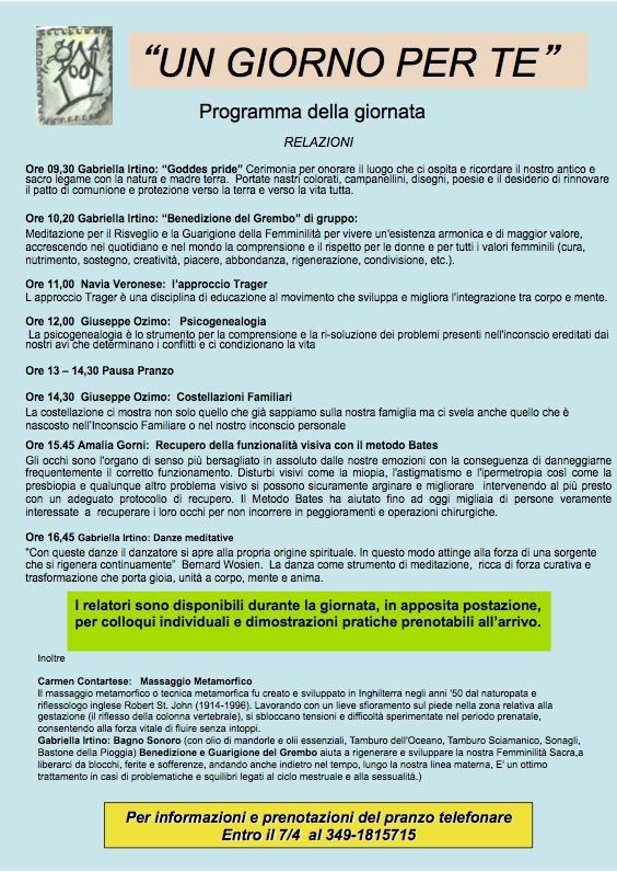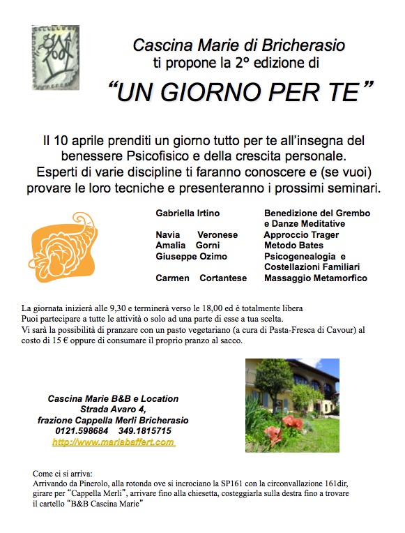 Il Centro Pedagogico di Danza e Cultura Popolare con il B&B Location Cascina Marie organizza per Domenica 10 aprile dimostrazioni gratuite di discipline olistiche per il benessere personale. Una giornata all'insegna del benessere psicofisico e della crescita personale con degli esperti che faranno conoscere e provare le tecniche e presentano i prossimi seminari. L'incontro inizia alle 9,30 e termina alle 18 con possibilità di pranzare un pasto vegetariano oppure di consumare il proprio pranzo al sacco.
