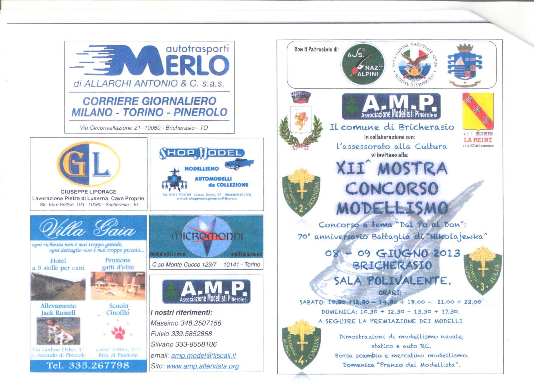 al Salone Polivalente il Comune di Bricherasio organizza con l'Associazione Modellisti di Pinerolo la XII mostra concorso modellismo. Dimostrazioni di modellismo navale, elicotteri, automobili e mostra scambio e mercatino del modellismo. Domenica i mezzi militari gireranno insieme ai fuori strada nella pista a lato del polivalente e anche in questo caso sui mezzi militari potranno salire i bambini.