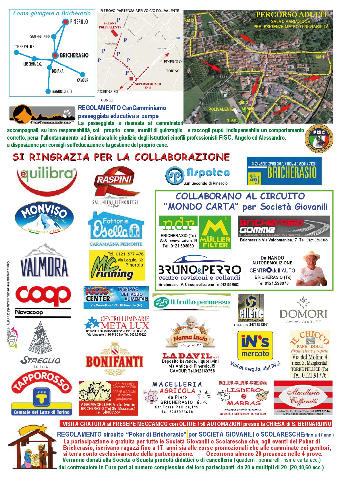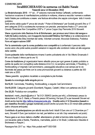 L’Avis di Bricherasio promuove e organizza in collaborazione con l’Atletica Val Pellice, Podistica None e le locali associazioni ASD Brike Bike, Volontari del verde, Volontari comunali, Motoclub Edelweiss per venerdì 14 dicembre l'undicesima edizione della StraBricherasio, quinto memorial Andrea Caffaratti, ultima prova del poker podistico bricherasiese. La manifestazione regionale di corsa su strada giovanile è una podistica serale con Babbo Natale, non competitiva con sezioni di Fitwalking, Nordic Walking, camminata a passo libero libera a tutti e quarta edizione della Can Camminiamo, passeggiata educativa a 6 zampe per le vie illuminate di Bricherasio. La camminata con i cani è riservata ai camminatori accompagnati col proprio cane, muniti di guinzaglio e raccogli pupù ed è indispensabile un comportamento corretto pena l’allontanamento ad insindacabile giudizio dei due istruttori cinofili professionisti. Il cuore pulsante della corsa lascia la centrale Piazza Santa Maria per trasferirsi al Salone Polivalente che diventa il punto di partenza ed arrivo di tutte le categorie podistiche in programma. Il ritrovo per la conferma e per nuove iscrizioni è dalle 18 al Salone Polivalente di Piazza Don Morero. Le partenze: ore 19,20 la Camminata con gli istruttori di fitwalking e nordic Walking Elio Bettini e Prone Dario (1 o 2 giri di Km 3,1), a seguire la CanCamminiamo (1 giro di Km 3,1), ore 19,30 categorie giovanili (da Km 0,300 a km 3 a secondo l'età), ore 20,20 la podistica non competitiva (km 6,2, 2 giri di Km 3,1). Per informazioni ed iscrizioni fino a mercoledì 12 dicembre, scadenza tassativa per Società e gruppi, telefonare allo 0121/598403 o scrivere a merlo_claudio@yahoo.it oppure recarsi alla Tabaccheria Peirone di Piazza Santa Maria, 10 a Bricherasio e al MC Running in Via Clemente Lequio, 62 a Pinerolo segnalando nominativo, tipo di gara, società o gruppo di appartenenza ed anno di nascita per le giovanili e si può aderire sul posto fino a venti minuti prima della partenza. Parte del ricavato andrà alla squadra AIB di Bricherasio per il nuovo modulo antincendio e il restante all’AVIS ed alle altre associazioni sul territorio. A tutti i partecipanti sarà consegnato un pacco gara con generi alimentari oltre al ristoro all’arrivo con bevande calde e fredde, panini con salsiccia, biscotti, panettoni e vin brulè. Dopo la gara cena o pizza del podista alla Pizzeria “Al Cartoccio” e all’Agriturismo “La Bacca Blu“. La manifestazione rientra nella ventesima edizione del Natale a Bricherasio.