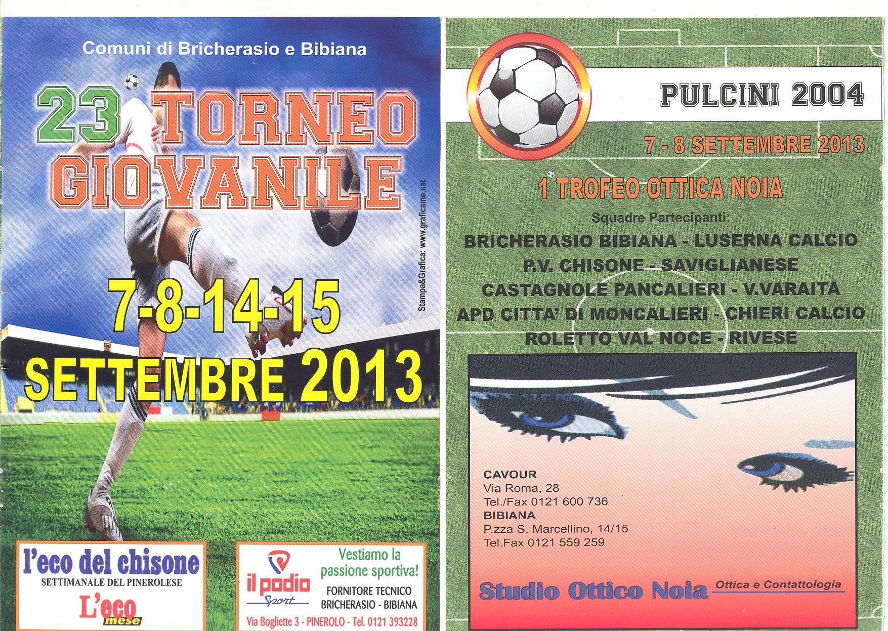 Il torneo giovanile di calcio “Comune di Bricherasio” in programma sabato 7 e Domenica 8 settembre per le categorie Pulcini ed Esordienti da 23 anni apre la stagione calcistica pinerolese. La società Bricherasio/Bibiana, da oltre quattro lustri organizza questo tradizionale ritrovo di giovani calciatori, inserisce la manifestazione nel programma della 45^ Sagra dell’Uva dove gli ingredienti essenziali sono entusiasmo e voglia di partecipare. Per i Pulcini 2004 a 6 giocatori le dieci squadre partecipanti sono con la società organizzatrice Bricherasio/Bibiana Luserna, Progetto Val Chisone, Saviglianese, Castagnole Pancalieri, Val Varaita, Moncalieri, Calcio Chieri, Roletto Val Noce e Rivese e si giocano il primo trofeo Ottica Noia. I Pulcini 2003 a 7 disputano il secondo trofeo Motorglass e le compagini iscritte sono Luserna, Scarnafigi, Progetto Val Chisone, Infernotto, Saviglianese, Saluzzo, Revello, Città di Saluzzo e Calcio Chieri. Entrambe le categorie dei Pulcini si sfidano sul campo di Via San Vincenzo a Bibiana. Al Calleri di Sala di Bricherasio competono per il secondo trofeo Fiamma Investigazioni gli Esordienti 2002 a 9 e con i padroni di casa del Bricherasio-Bibiana infilano le scarpette bullonate Luserna, Progetto Val Chisone, Calcio Chieri, Rivese, San Secondo, San Pietro Val Lemina, Cavour. Calcio d’inizio alle ore 15.