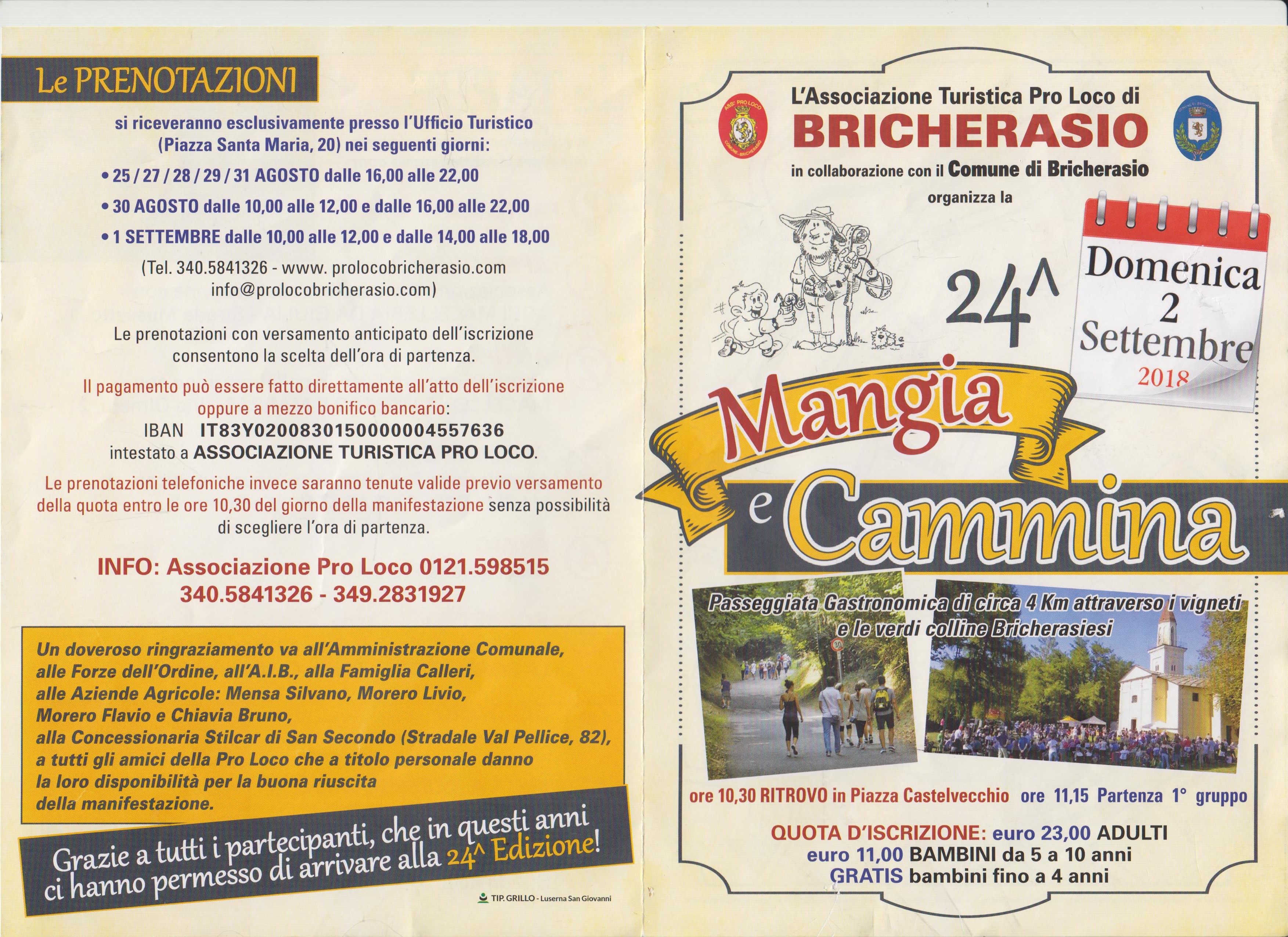 La prima Domenica di settembre appuntamento ormai classico a Bricherasio con la 24^ edizione della “Mangia e Cammina”, itinerario sulle colline del paese costellate di vigneti dove la musica e l'allegria fanno da cornice alla manifestazione, che rientra nel cartellone eventi della 50^ Sagra dell’Uva. Appuntamento, organizzato dalla Pro Loco in collaborazione con il Comune, per il 2 settembre con il via del primo gruppo alle ore 11.15, per gustare i sapori della buona tavola piemontese, assaporando i prodotti della terra bricherasiese e riscoprendo le tradizioni contadine, immersi nel verde ed a pieno contatto con la natura, una giornata che farà dimenticare le ansie e lo stress della vita quotidiana. La manifestazione è diventata un appuntamento fisso per gli amanti del divertimento in compagnia, con un numero di iscritti sempre in crescendo, tanto da superare i 1300 nelle ultime edizioni. La buona cucina si può gustare in sette comode tappe con una sana passeggiata in zone panoramiche, pur cambiando il percorso, l’arrivo resta sempre nel posto più suggestivo del paese: la Collina del Castello. La Pro Loco ringrazia i possessori dei terreni ed i commercianti che collaborano alla gestione delle diverse tappe. Si inizia con l'aperitivo offerto dalla Pro Loco e dall’Agrimacelleria da Giulia nella piazzetta del peso pubblico poi due postazioni con antipasti tipici: la prima, in collaborazione con la Macelleria Lisdero & Marras, nell’incantevole cornice del Parco di Villa Calleri di Sala, dove i partecipanti possono visitare i giardini della famiglia Cacherano di Bricherasio e la seconda, con il contributo della Macelleria Caffaratti,sotto l’Ala comunale. Nella tappa successiva si possono gustare degli ottimi agnolotti alla piemontese ed un minestrone casalingo nell’ampio parcheggio esterno della Ditta Lorenzo Levetti, proposti dalla Pro Loco. Prima della discesa ai Brandin postazione con il sorbetto della Gelateria “La Sorbetteria” mentre come secondo piatto la grande grigliata nel salone sede della Pro Loco e per finire dessert, frutta e caffè in collaborazione con l’Agriturismo “Bacca Blu” rallegrati da musica, divertimento, e tanta allegria nel piazzale della Chiesa del Castello, il tutto innaffiato da vino ed acqua a volontà. Tutta la macchina organizzativa è operativa e le prenotazioni si ricevono esclusivamente all’Ufficio turistico in Piazza Santa Maria n. 20 nei seguenti giorni: sabato 25, lunedì 27, martedì 28 mercoledì 29 e venerdì 31 agosto dalle ore 16 alle ore 22, giovedì 30 oltre all’orario pomeridiano anche la mattina dalle ore 10 alle 12 e sabato 1 settembre dalle 10 alle 12 e dalle 14 alle 18. Le prenotazioni con versamento anticipato dell’iscrizione consentono la scelta dell’ora di partenza. Il pagamento può essere fatto direttamente all’atto dell’iscrizione oppure tramite bonifico su IBAN IT 83 Y 02008 30150 000004557636 intestato all’Associazione Pro Turistica Pro Loco di Bricherasio. Le prenotazioni telefoniche invece saranno tenute valide previo versamento della quota entro le ore 10,30 del giorno della manifestazione senza possibilità di scegliere l’ora della partenza. La quota di partecipazione è di 23 €, per i bambini dai 5 ai 10 anni si pagano 11 € e fino ai 4 anni l’iscrizione è gratuita. Ulteriori informazioni alla Pro Loco al numero 340/5841326 oppure sul sito internet www.prolocobrichersio.com