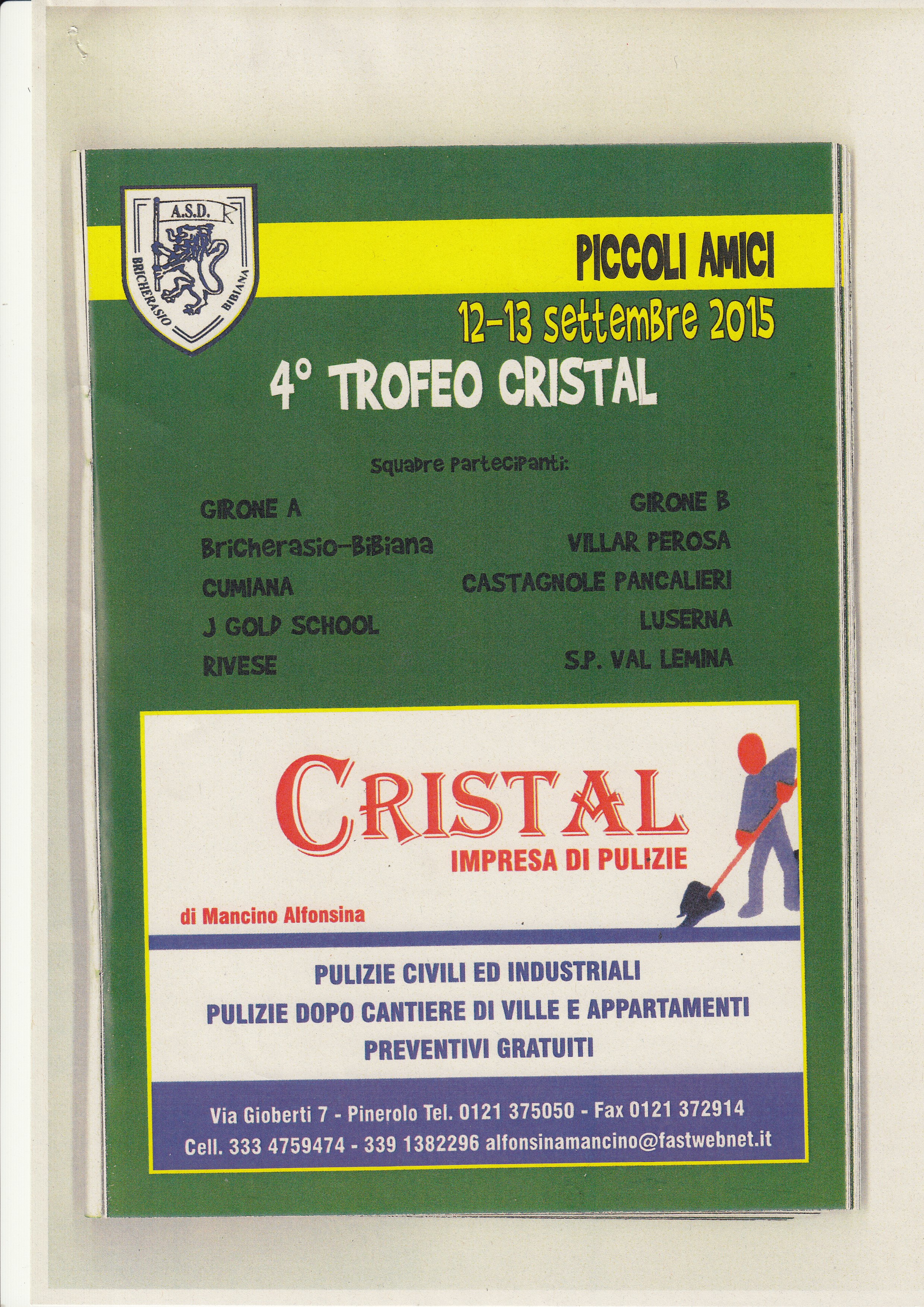 Prosegue nel weekend del 12 e 13 settembre la venticinquesima edizione del torneo giovanile di calcio “Comune di Bricherasio” per le categorie Piccoli Amici, Pulcini 2007 ed Esordienti 2003. Numeri sempre più importanti caratterizzano una manifestazione organizzata da cinque lustri dalla società Bricherasio/Bibiana, un tradizionale ritrovo di giovani calciatori ed inserisce la manifestazione nel programma della 47^ Sagra dell’Uva dove gli ingredienti essenziali sono entusiasmo e voglia di partecipare. Anche in questo weekend, dell'importante kermesse di calcio giovanile, saranno presenti otto squadre per ogni categoria. La manifestazione ha la particolarità che è un appuntamento importante cresciuto qualitativamente di anno in anno e che si rinnova dal 1991 e permette di avere prestigio e visibilità. Al Calleri di Sala di Bricherasio competono per il quinto memorial “Salvatore Vruna”, Maresciallo dei Carabinieri, gli Esordienti 2003 e con la società organizzatrice del Bricherasio/Bibiana scendono sul terreno di gioco J Gold School, Infernotto e Progetto Val Chisone nel primo girone e Revello, Savigliano, Piossasco e Scarnafigi nel secondo. Infilano le scarpette bullonate i Pulcini nati nel 2007 a 5 giocatori dei padroni di casa del Bricherasio/Bibiana, con Scarnafigi, Piossasco e Saluzzo nel girone A mentre Savigliano, Pinerolo, J. Gold School e San Pietro Val Lemina giocano nel girone B e si contendono il 25^ Trofeo “Comune di Bricherasio”. Nella manifestazione Piccoli Amici che giocano il quarto Trofeo “Cristal” tra le compagini iscritte con il Bricherasio/Bibiana, Cumiana, Rivese e J Gold School nel girone A e Villar Perosa, Castagnole Pancalieri, Luserna e San Pietro Val Lemina. Calcio d’inizio alle ore 15.