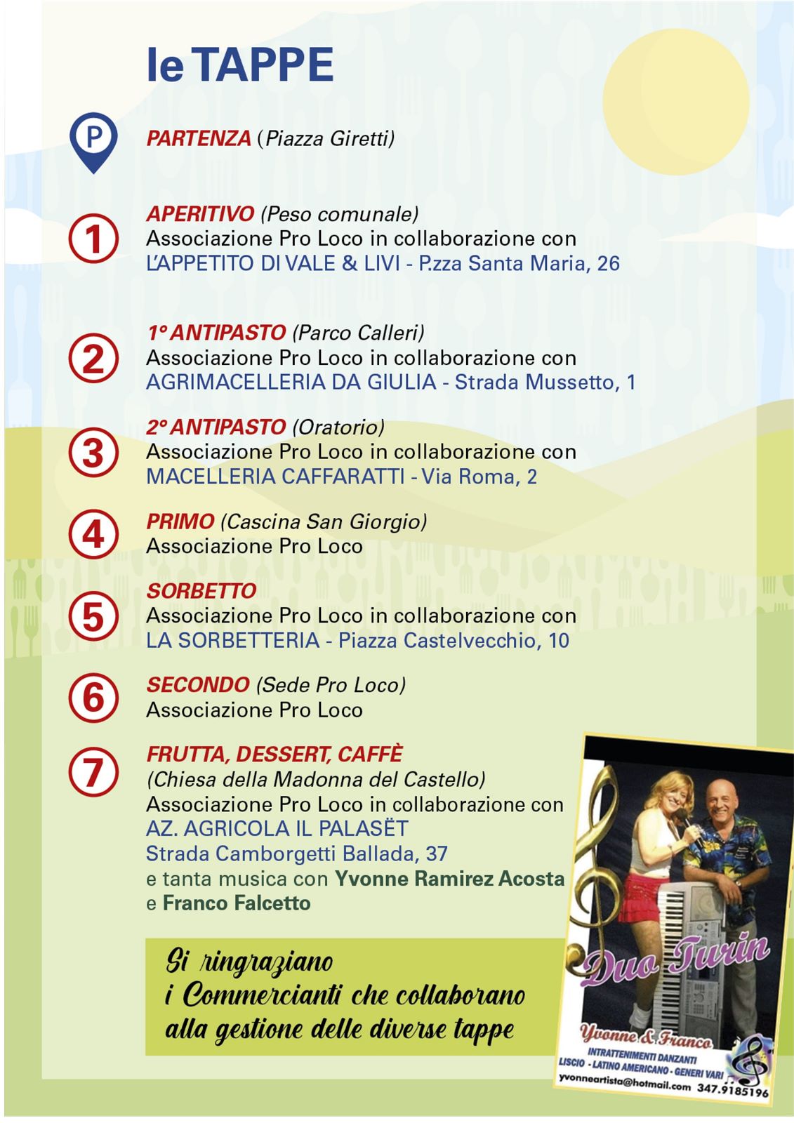 La 27° “Mangia e cammina”, la nota passeggiata gastronomica di circa 4 km fra i filari e le verdi colline a cura della locale Proloco in collaborazione con il Comune di Bricherasio si svolge Domenica 3 settembre. La macchina organizzativa parte dalle iscrizioni che si ricevono esclusivamente all'Ufficio Turistico di Piazza Santa Maria, 20 a partire da lunedì 28 agosto dalle ore 16 alle 22 proseguono martedì 29,mercoledì 30 e venerdì 1 settembre alla stessa ora. Giovedì 31 oltre all'orario pomeridiano le adesioni si ricevono anche la mattina dalle ore 10 alle 12 come sabato 2 settembre dove nel pomeriggio l'ufficio turistico sarà aperto dalle 14 alle 18. La quota è fissata in € 26, ridotta per i ragazzi dai 5 ai 10 anni ad € 13. I bambini di età inferiore non pagano. Il pagamento può essere fatto all'atto dell'iscrizione oppure a mezzo bonifico bancario sull'iban IT83Y0200830150000004557636 intestato all'associazione Turistica Pro Loco con carta di credito o bancomat o satispay. Si parte da Piazza Giretti con la Pro Loco protagonista in tutte e sette le tappe e si arriva al peso comunale di Via Campiglione per l'aperitivo proposto in collaborazione con L'Appetito di Vale & Livi. Si passeggia fino a Villa Calleri per il primo antipasto nel parco a cura dell'Agrimacelleria Da Giulia mentre il secondo antipasto è gestito dalla macelleria Caffaratti all'Oratorio San Domenico Savio di Via del Portone. La Cascina San Giorgio ospita nella propria sede di Via Molarosso i primi piatti. All'incrocio con Strada Brandin si assapora il sorbetto de La Sorbetteria e dopo si scende alla sede della Pro Loco in Piazza Don Morero per costine, salsiccia e patatine cucinate dai volontari della storica associazione bricherasiese prima di salire al Castello (in foto un momento della passata edizione) del paese per frutta, dessert e caffè con l'Azienda Agricola Il Palaset e tanta musica con Yvonne Ramirez Acosta e Franco Falcetto. Ritrovo in Piazza Giretti alle ore 10,30 e partenza del primo gruppo prevista alle 11,15.