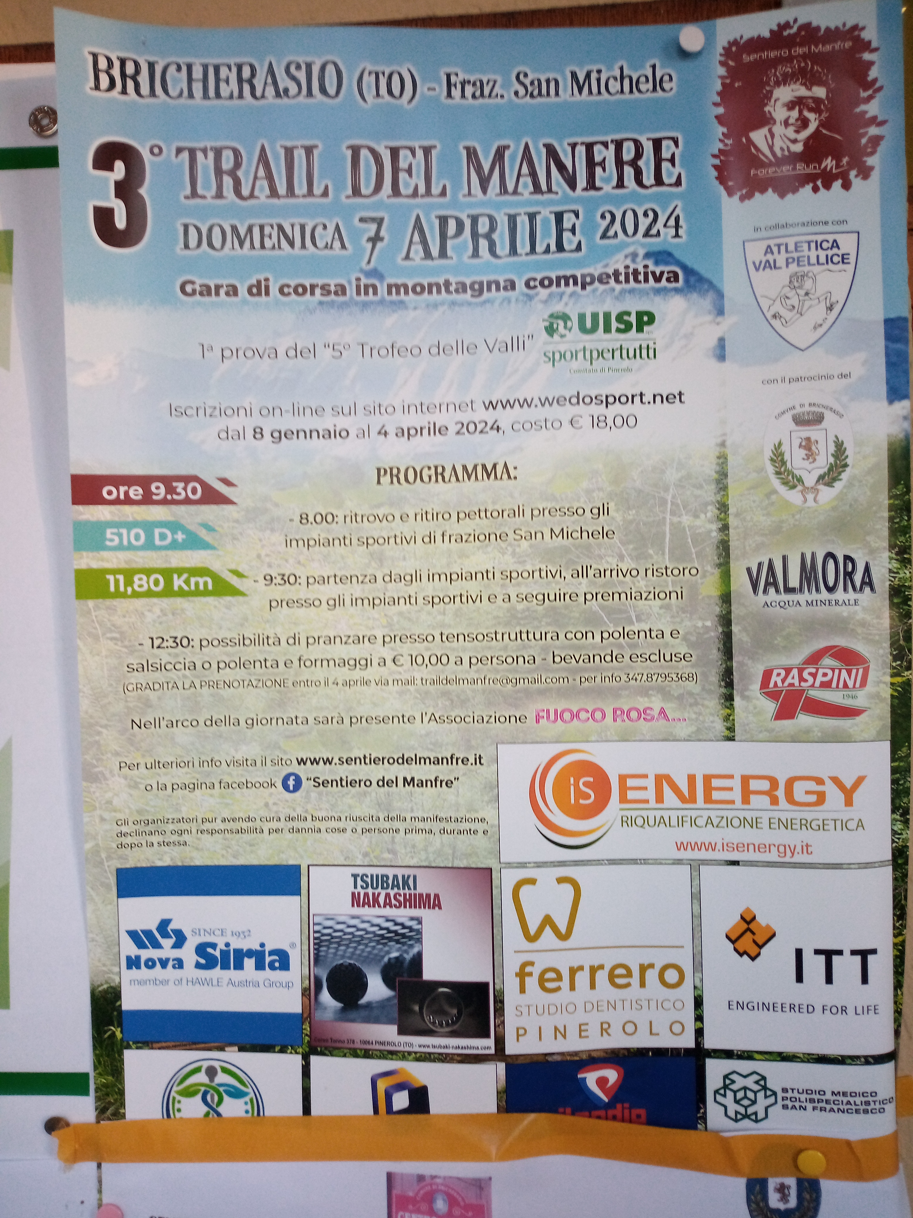 L’associazione “Sentiero del Manfre” organizza per domenica 7 aprile nella Frazione San Michele” in collaborazione con l'Atletica Val Pellice e con il sostegno del Comune di Bricherasio la 3^ edizione del Trail del Manfre e del Trofeo delle Valli, circuito di sei gare podistiche nel pinerolese. La gara podistica competitiva, in memoria del caro Claudio Manfredi appassionato di corsa in montagna deceduto qualche anno fa, si svolgerà su sentieri e strade interamente all'interno del comune di Bricherasio, con un livello di difficoltà adatto ai runner ed ai camminatori. Il sentiero del Manfre, realizzato dal gruppo di amici storici e da quelli del podismo chiamato Manfre Forever Run, parte ed arriva alla chiesa della frazione di San Michele, costeggia la Comba e sale verso "il sentiero delle 5 vie" per scollinare in località Piani. Inizia la discesa verso borgata Cuccia fino a ritornare alla Comba per riprendere il sentiero fatto precedentemente fino all'arrivo. Sono già aperte le iscrizioni che si effettuano unicamente sul sito internet www.wedosport.net compilando l'apposito modulo. Il costo d'iscrizione ammonta a 18 €, con la garanzia di un capo tecnico per i primi 300 iscritti. Gli organizzatori fanno sapere che la chiusura delle iscrizioni è fissata alle ore 24 di giovedì 4 aprile. Non saranno in alcun modo accettate iscrizioni né cambio nominativi dopo la scadenza citata. Verranno premiati i primi 5 assoluti di uomini e donne, i primi over 50 sempre maschile e femminile. Premi speciali over 65. Gli organizzatori fanno sapere che "a tutti gli iscritti sarà fornito un ristoro per sopperire alla impossibilità di predisporre detto servizio prima, durante ed al termine della gara". Per maggiori informazioni contattare Sandro Caffaratti al numero 347/8795368.La traccia del percorso di 11,5 km con un dislivello positivo di 510 metri, è scaricabile con qr code sulla palina installata alla partenza od al link su questa pagina. Partenza prevista alle ore 9.30. La corsa apre il criterium composto da sei prove di corsa in montagna denominato "5^ Trofeo delle Valli" che proseguirà fino a domenica 16 giugno, su iniziativa dell'ASD Atletica Valpellice, GASM Torre Pellice, ASD Li Viol Ousitan, Sport Club Angrogna e Piossasco Trail Runners.