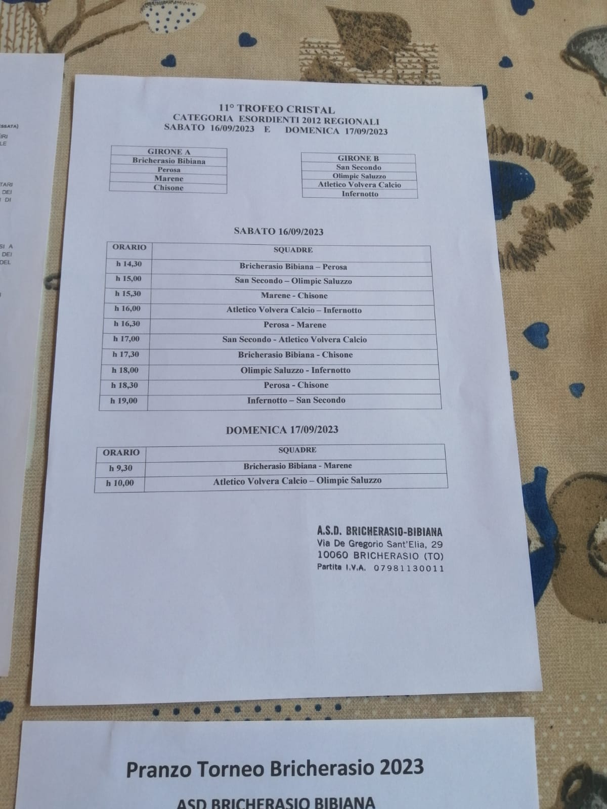 A Bricherasio agli inizi di settembre, da oltre trent'anni, si gioca il torneo giovanile di calcio "Comune di Bricherasio" apertura della nuova stagione organizzato dall'Asd Bricherasio Bibiana che richiama sempre sulle tribune gremite del "Calleri di Sala" centinaia di appassionati accompagnati da genitori, nonni e amici che colorano il tappeto verde con le divise sociali. Il torneo prosegue nel fine settimana del 16 e 17 con altre due categorie. Scendono sul terreno di gioco del "Calleri di Sala" gli Esordienti 2012 che disputano l'11 trrofeo Cristal dei padroni di casa del Bricherasio Bibiana, con Chisone, Marene e Perosa inseriti nel primo girone mentre nel girone B giocano Atletico Volvera, Infernotto, Olimpic Saluzzo e San Secondo e dopo una prima fase all'italiana le migliori due dei raggruppamenti disputano un ulteriore girone all'italiana per stabilire la vincente del trofeo. Anche le altre squadre continuano a gareggiare per la quinta posizione. La categoria Primi Calci 2015/16 a 5 giocatori calpesta l'adiacente campo in sintetico e si battono per il primo trofeo L'Occasione e nel girone A ci sono gli ospitanti del Bricherasio Bibiana con Roletto Val Noce, Scalenghe e Soccer Academy Piscinese. Le altre squadre inserite nel secondo girone sono Infernotto, Morevilla, San Pietro Val Lemina e San Secondo e la formula non cambia. Calcio d'inizio alle ore 14,30