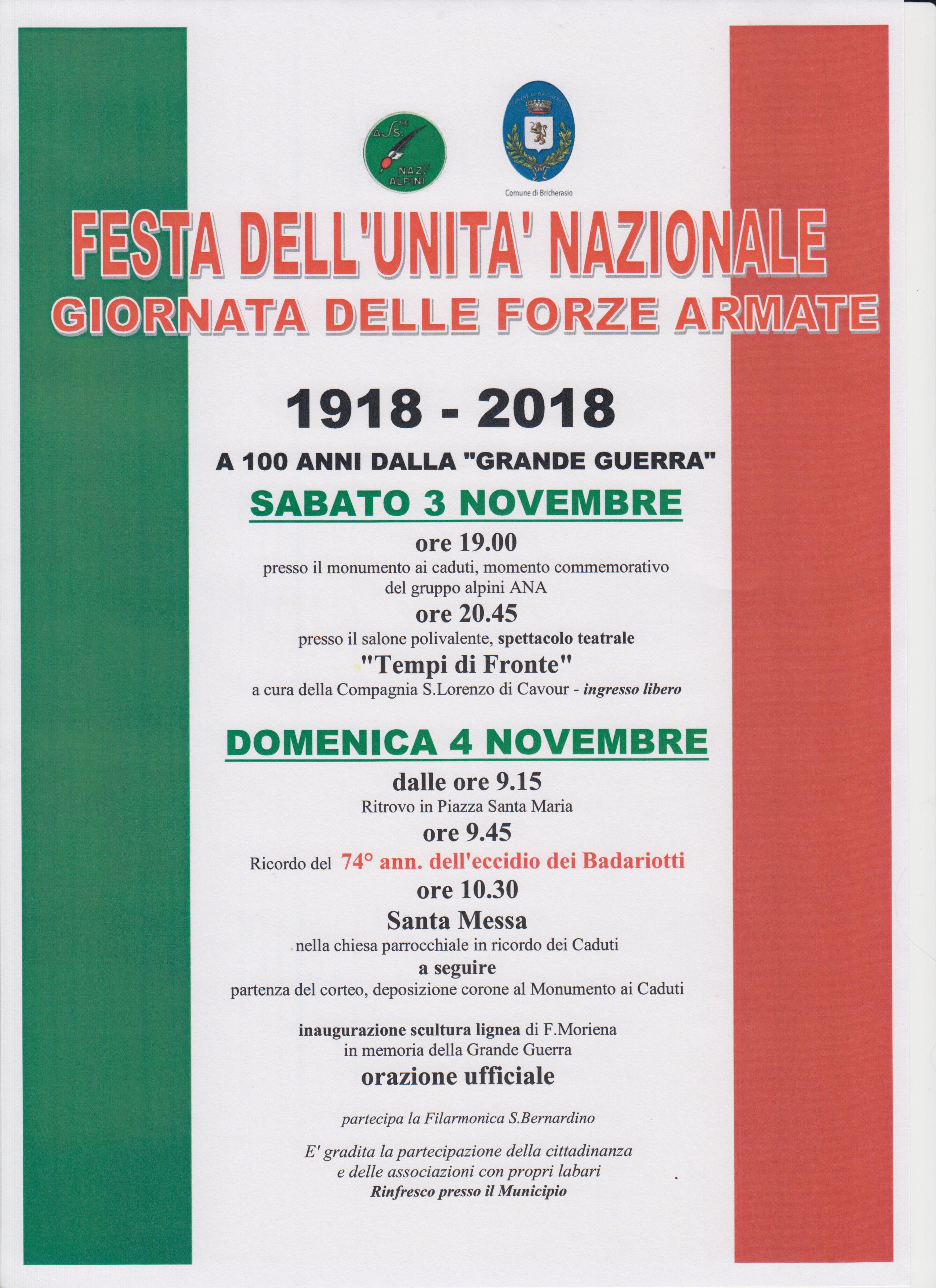 Il Comune di Bricherasio e il Gruppo Alpini invitano tutti i cittadini a partecipare alle celebrazioni per la Festa dell’Unità Nazionale e Giornata delle Forze Armate in occasione del 100º Anniversario della conclusione della “Grande Guerra”. Sabato 3 novembre alle ore 20,45 lo spettacolo teatrale “Tempi di Fronte" proposto dalla Compagnia San Lorenzo di Cavour al Salone Polivalente di Piazza Don Morero, ingresso libero. Domenica 4 le celebrazioni iniziano con il ritrovo in Piazza Santa Maria alle ore 9,15 al quale seguirà alle 9,45 alla Borgata Badariotti il ricordo del 74º Anniversario dell’Eccidio della famiglia Castagno. Alle 10,30 la Santa Messa che si celebra nella Chiesa Parrocchiale del capoluogo in ricordo dei caduti e dopo la funzione partenza del corteo per il cimitero per la deposizione di corone al Monumento ai Caduti, con l’orazione ufficiale e l’inaugurazione di una scultura lignea realizzata da Fabio Moriena in memoria dei caduti della Grande Guerra. Prevista la partecipazione della Filarmonica San Bernardino, al termine rinfresco in municipio. In caso di maltempo cerimonia presso l'ala comunale.