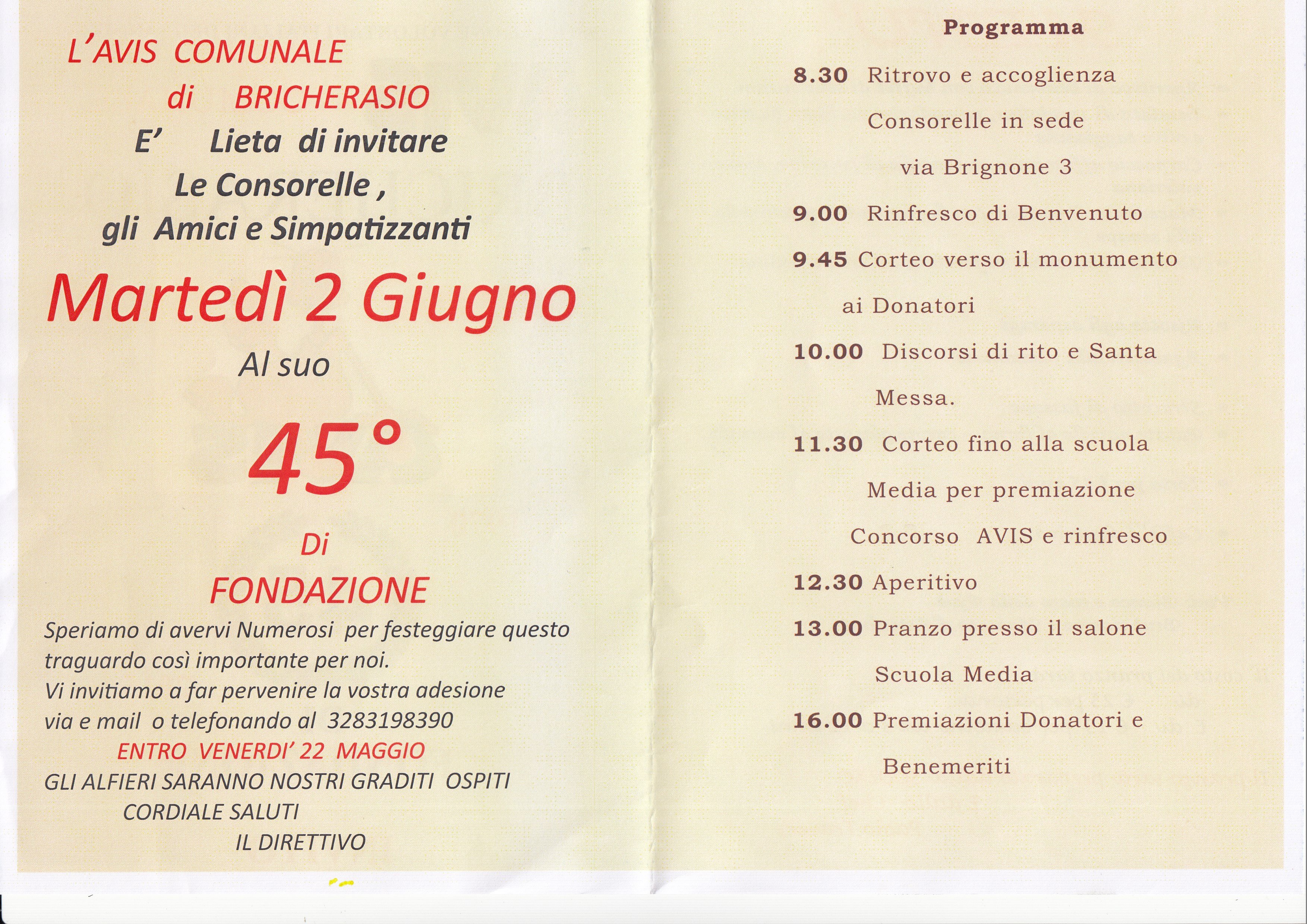 L’AVIS di Bricherasio festeggia i 45 anni di fondazione con un ricco programma per martedì 2 giugno con amici, consorelle e simpatizzanti. Alle ore 8,30 il ritrovo e l’accoglienza delle consorelle presso la sede di Via Brignone, 3 a cui segue il rinfresco di benvenuto ed il corteo verso il monumento ai donatori di Piazza Castelvecchio per i discorsi e le orazioni ufficiali e la Santa Messa nella Parrocchia di Santa Maria delle ore 10,30. Dopo la funzione corteo fino alle scuole medie per la premiazione del concorso AVIS e rinfresco. Dopo l’aperitivo il pranzo alle ore 13,00 preparato dallo chef Paolo Travers presso il salone della Scuola Media con un menù composto da insalata di seppioline, carpaccio affumicato, verdure con bocconcini di tacchinella, tortino di zucchine su fonduta come antipasti. Due primi piatti con agnolotti alla piemontese e risotto agli asparagi e come secondo lo stracotto di fassone con contorno di patate e carote. Chiude la torta dei 45 anni con caffè e digestivo. Il costo del pranzo è di € 25 a persona e di 13 € per i bambini dai 3 ai 12 anni e l’adesione telefonica al presidente dell’Associazione Savalli Michele al 328/3198390 oppure in via telematica all’indirizzo e-mail avisbricherasio@live.it entro venerdì 22 maggio. Al termine del convivio premiazione ai donatori e benemeriti.