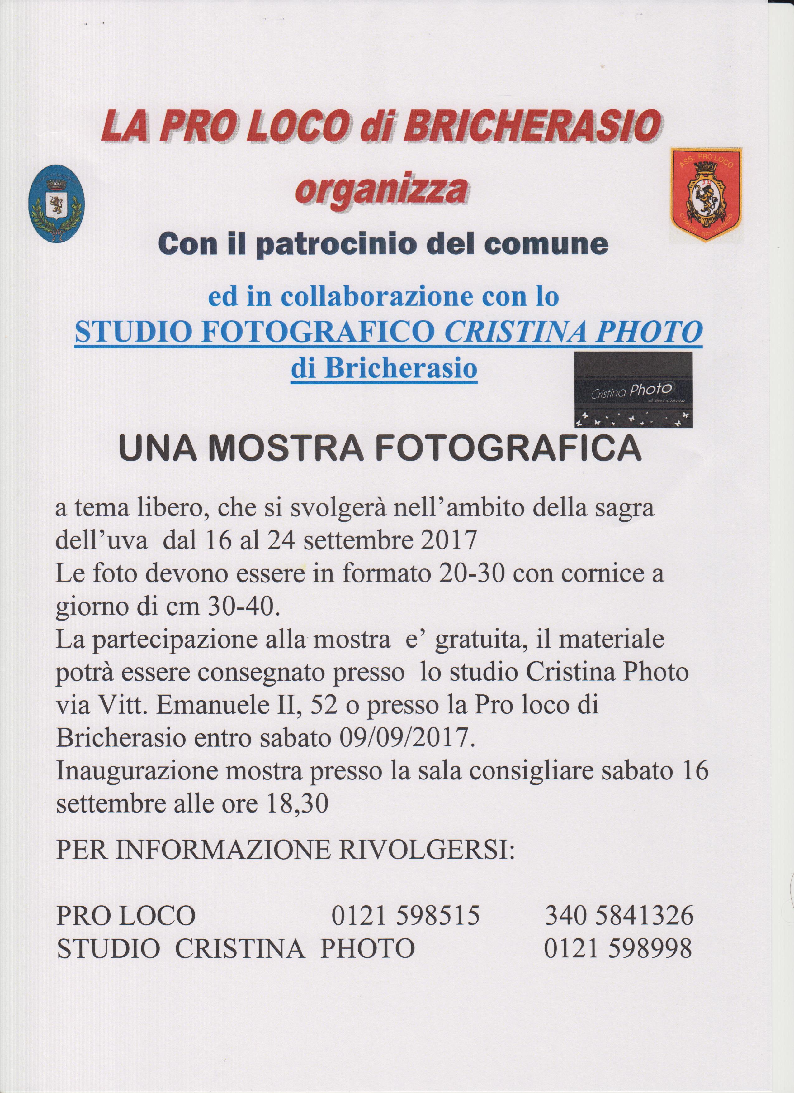 Dal 2 al 30 settembre 2017 Bricherasio è di nuovo in festa per la 49° edizione della Sagra dell'Uva, che vedrà il suo culmine nel weekend 23-24 settembre con la tradizionale sfilata dei carri allegorici, il Gran Mercato d'Autunno e la riproposizione della "Piazza del Gusto", con la Piazza Castelvecchio che ospiterà gli stand dei produttori vinicoli della DOC Pinerolese e darà la possibilità di gustare con servizio di ristorazione a self-service i piatti della tradizione a cura dei produttori agroalimentari e dei commercianti locali.