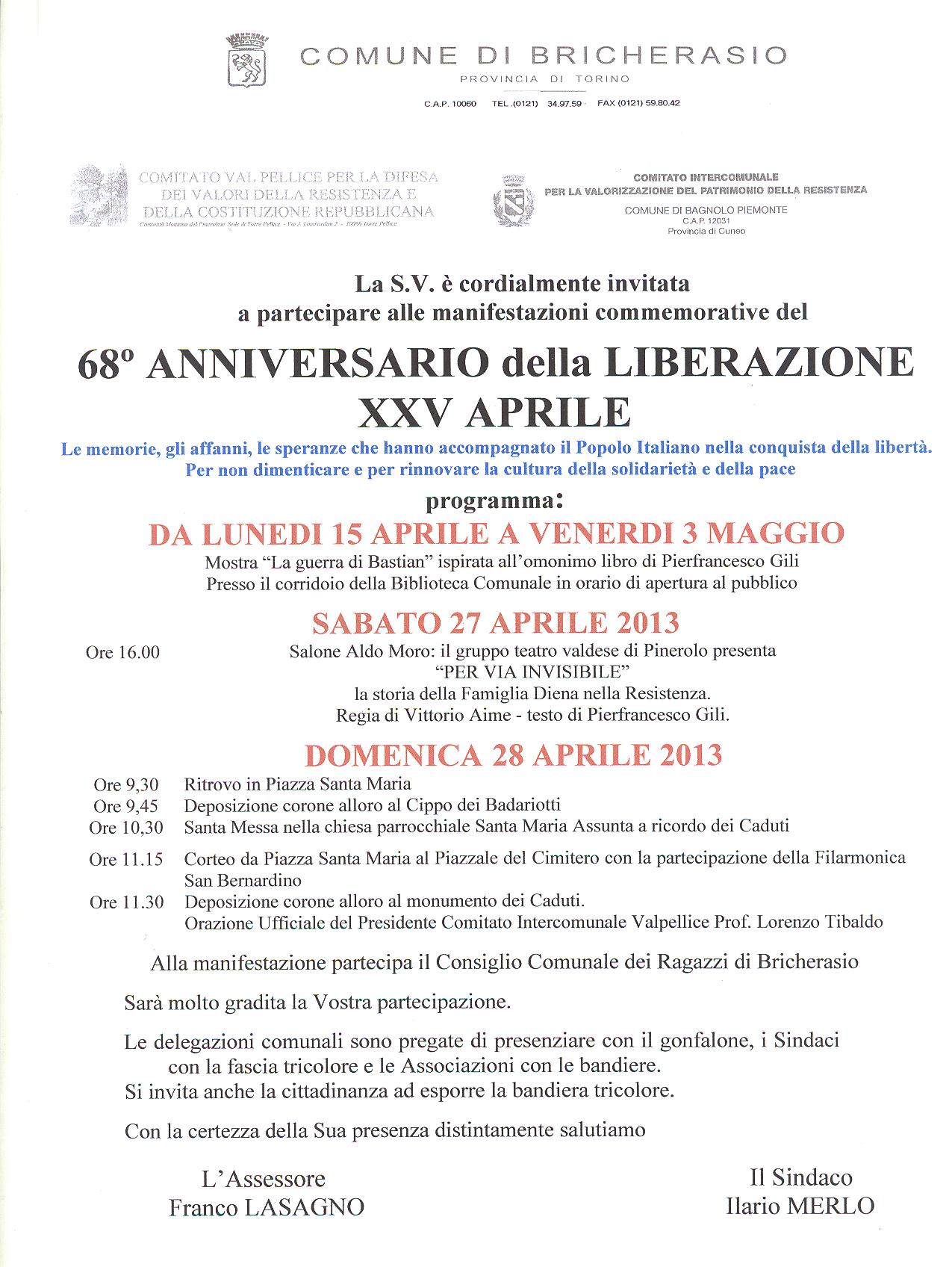 Il Comune di Bricherasio, invita la popolazione a partecipare alle manifestazioni celebrative del 68º Anniversario della Liberazione previste per sabato 27 e Domenica 28 aprile con un sensibile programma per la ricorrenza alla quale partecipa il Consiglio Comunale dei Ragazzi. Alle ore 16 del 27 aprile nella sala “Aldo Moro” il gruppo teatro valdese di Pinerolo presenta “Per via invisibile” la storia della famiglia Diena nella Resistenza sotto la regia di Vittorio Aime. La Domenica cominciano le celebrazioni alle ore 9,30 con il ritrovo in Piazza Santa Maria per recarsi al Cippo dei Badariotti per la consueta deposizione della corona d’alloro. Dopo la Santa Messa in ricordo dei caduti delle 10,30 partenza del corteo con autorità, popolazione, Associazioni dalla Chiesa al piazzale del cimitero con la partecipazione della Filarmonica San Bernardino per la deposizione di corone al Monumento dei Caduti, il saluto delle autorità e l’orazione ufficiale del Prof. Lorenzo Tibaldo, Presidente del Comitato Intercomunale Valpellice. Fino a venerdì 3 maggio è possibile visitare, presso la Biblioteca Comunale, la mostra “La guerra di Bastian” ispirata all’omonimo libro di Pierfrancesco Gili.