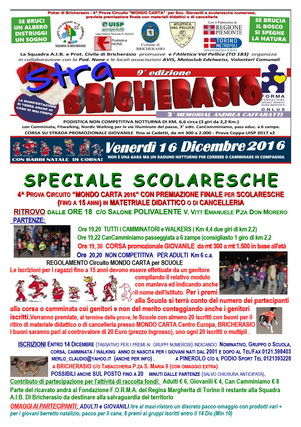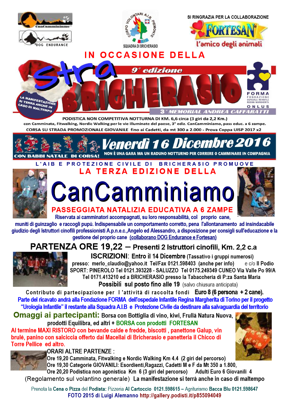 La Squadra AIB e Protezione civile di Bricherasio promuove e l’Atletica Val Pellice organizza in collaborazione con la Podistica None le locali associazioni Avis, Motoclub Edelweiss e Volontari Comunali per venerdì 16 dicembre la nona edizione della StraBricherasio, terzo memorial Andrea Caffaratti, ultima prova del poker podistico bricherasiese. La manifestazione regionale di corsa su strada giovanile è una podistica notturna con Babbo Natale, non competitiva con sezioni di Fitwalking, Nordic Walking, camminata a passo libero libera a tutti e terza edizione della Can Camminiamo, passeggiata educativa a 6 zampe per le vie illuminate di Bricherasio. La camminata con i cani è riservata ai camminatori accompagnati col proprio cane, muniti di guinzaglio e raccogli pupù ed è indispensabile un comportamento corretto pena l’allontanamento ad insindacabile giudizio di due istruttori cinofili professionisti. Il cuore pulsante della corsa lascia la suggestiva e centrale Piazza Santa Maria per trasferirsi al Salone Polivalente di Piazza Don Morero che diventa il punto di partenza ed arrivo di tutte le categorie podistiche in programma. Il maxi ristoro si tiene all’esterno dell’edificio con la novità di qualche chilo di nutella e la conferma, come da tradizione, della salsiccia alla brace. Il ritrovo per le iscrizioni è alle ore 18,00 al Salone Polivalente di Piazza Don Morero a Bricherasio, la partenza dei bambini per una mini corsa o giochi con istruttori alle ore 19,00. I camminatori e i walkers partono alle 19,20 a cui segue la passeggiata con istruttori cinofili e le giovanili alle 19,30. Alle 20,20 la podistica non competitiva di 6 km. Per iscrizioni fino a mercoledì 14 dicembre scrivere a merlo_claudio@yahoo.it o recarsi al Podio Sport in Via Bogliette, 3/C a Pinerolo segnalando nominativo, tipo di gara, società o gruppo di appartenenza ed anno di nascita per le giovanili e si può aderire sul posto fino a 15 minuti prima della partenza. Parte del ricavato andrà alla Fondazione F.O.R.M.A. per il progetto “Urologia Infantile” ed il restante alla squadra AIB di Bricherasio da destinare alla salvaguardia del territorio. Essendo la manifestazione indetta per promuovere la cultura ecologica, il rispetto per l’ambiente e l’attività ludico motoria non sono previsti premi di merito ma a tutti i partecipanti sarà consegnato un pacco gara con generi alimentari oltre al ristoro all’arrivo con bevande calde e fredde, panini con salsiccia alla brace, biscotti, panettoni e vin brulè. Dopo la gara cena o pizza del podista al Ristorante-Pizzeria “Il Pirata”, alla Pizzeria “Al Cartoccio” e l’Agriturismo “La Bacca Blu“.La manifestazione rientra nella diciottesima edizione del Natale bricherasiese.