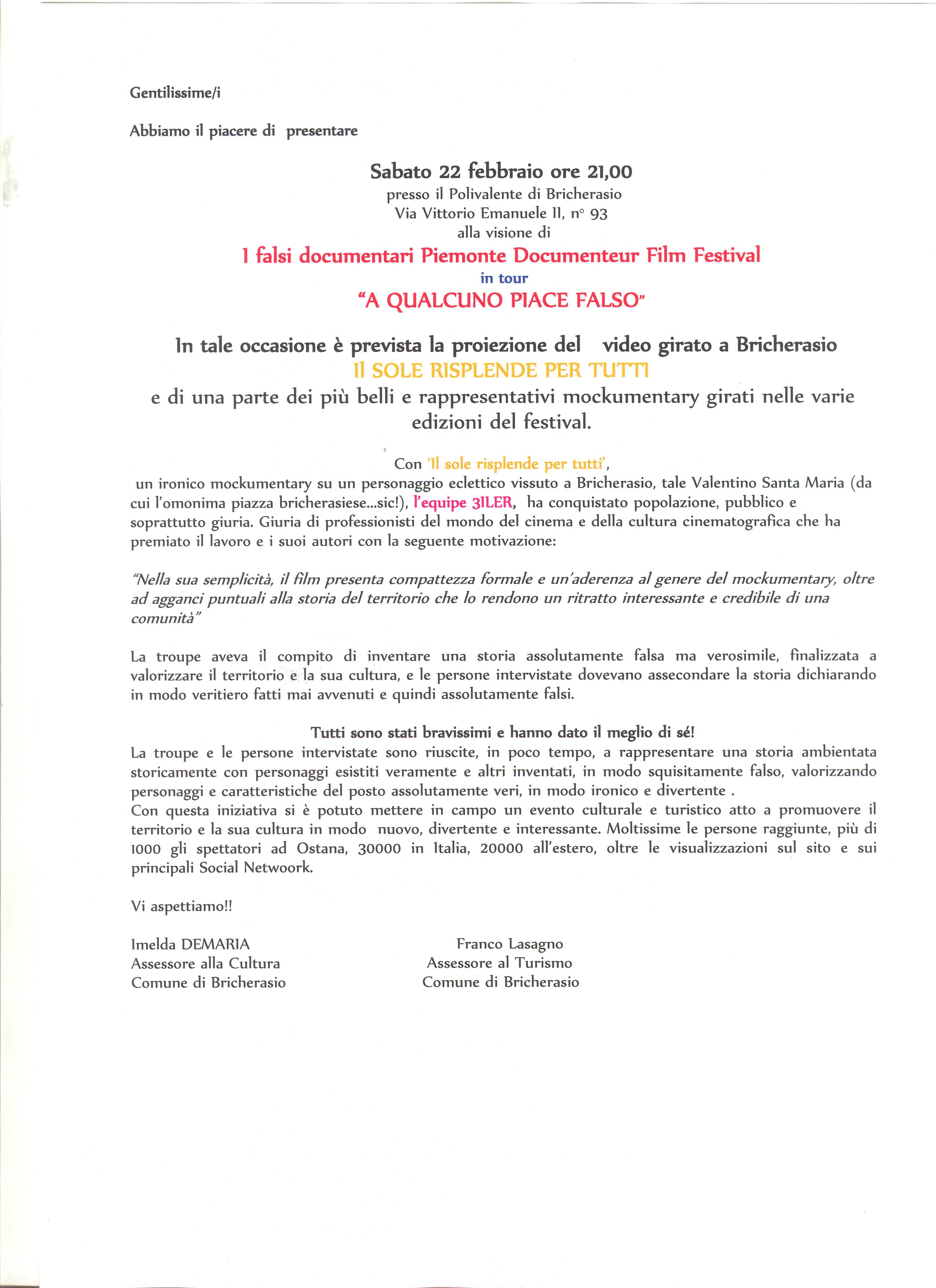 Un ironico mockumentary su un personaggio eclettico vissuto a Bricherasio, tale Valentino Santa Maria (da cui l’omonima piazza bricherasiese...sic!), l’equipe 3ILER, ha conquistato popolazione, pubblico e soprattutto giuria. Giuria di professionisti del mondo del cinema e della cultura cinematografica che ha premiato il lavoro e i suoi autori con la seguente motivazione: