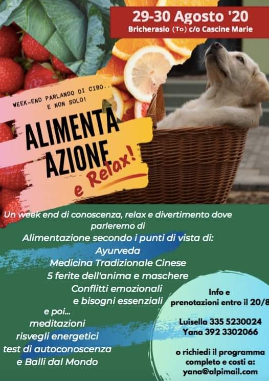 A Cascina Marie in Strada Avaro a Cappella Merli di Bricherasio nel weekend del 29-30 agosto si parla di cibo e non solo nella due giorni dedicata ad alimentazione e relax per conoscere gli aspetti secondo i puni di vista di Ayuneda , della medicina tradizionale cinese, dei conflitti emozionali e dei bisogni essenziali. Poi meditazione, risvegli energetci, test di autoconoscenza e come curar le ferite dell'anima. Per maggiori informazioni, prenotazioni ed ulteriori chiarimenti telefonare a Luisella al numero 335/5230024 oppure Yana al 392/3302066.