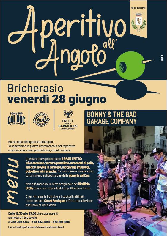 Dopo il grande successo di partecipanti di inizio mese altro appuntamento a Bricherasio con l’Aperitivo all'angolo in Piazza Castelvecchio organizzato dalla Pizzeria Dal Doc, dall’Agrimacelleria da Giulia, dal bar Cru e Barriques e dal Birrificio Drolle per la sera di venerdì 28 giugno. A partire dalle ore 18,30 si possono trovare gnocchi, patate, focacce e pizze proposte da Dal Doc di Marco Meneghello, affettati e formaggi preparati dall’Agrimacelleria, bollicine e cocktail della vineria Cru e Barriques e la birra artigianale fornita dal Birrificio Drolle non possono mancare e per informazioni e prenotazioni consigliate del tavolo si deve chiamare il numero 3482968337 oppure il 3488522694. Inoltre e' confermata la partecipazione di Bonny & The Bad Garage Company con il gruppo che ha accettato di suonare all'evento patrocinato dal Comune di Bricherasio. Musica a tutta birra assicurata a partire dalle 21.