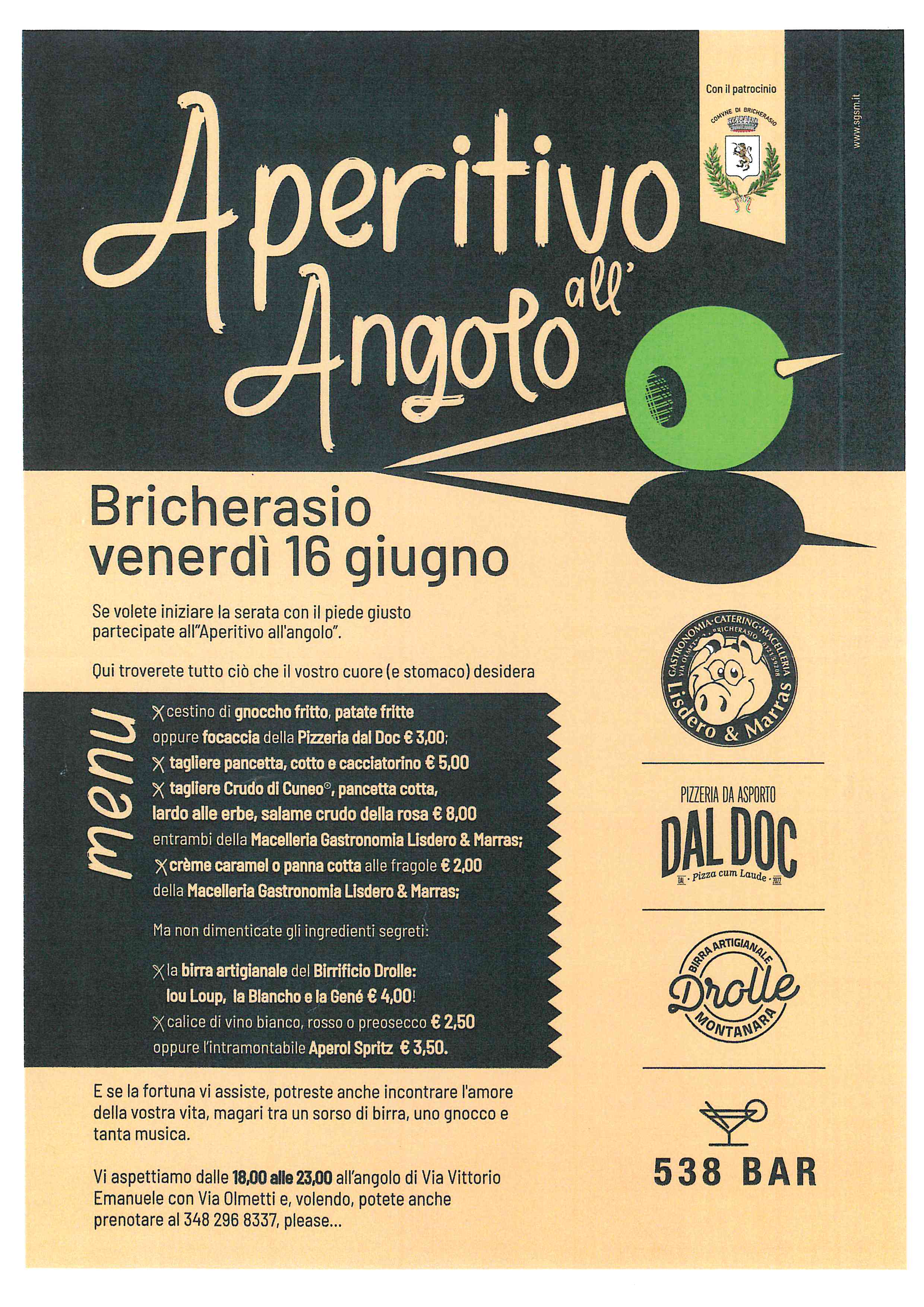 Venerdì 16 giugno dalle ore 18 Aperitivo all'angolo tra Via Vittorio Emanuele II e Via Olmetti organizzato dalla Macelleria Lisdero & Marras, dalla Pizzeria Dal Doc e da 538 Bar. A partire dalle ore 18 si possono trovare stuzzichini, taglieri, dolci, vino e l'intramontabile Spritz e per informazioni e prenotazioni si deve chiamare il numero 348/2968337