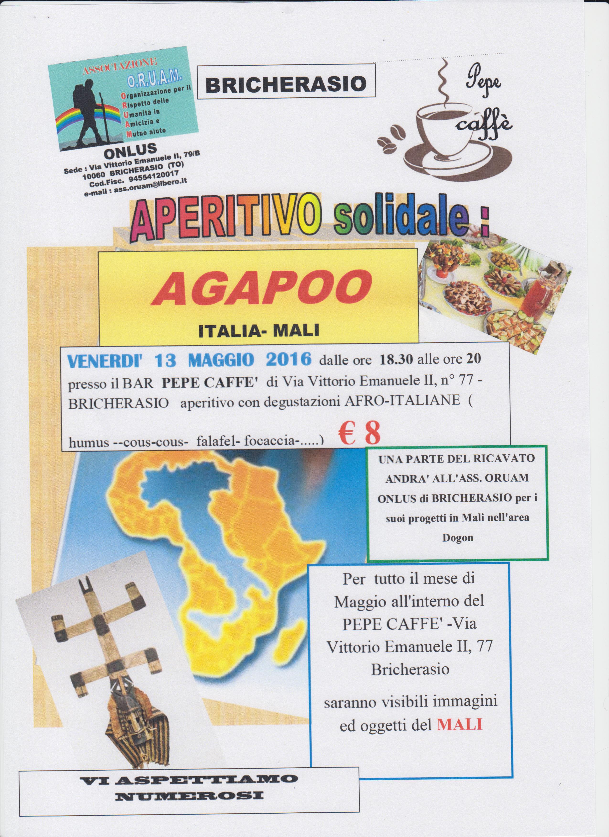L’Associazione ORUAM di Bricherasio organizza un aperitivo solidale aperto a tutti per venerdì 13 maggio dalle ore 18,30 alle 20 presso il Bar Pepe caffè di Via Vittorio Emanuele II, N. 77 di Bricherasio. L’aperitivo con degustazioni afro italiane di Italia e Mali come humus, cous cous, falafel, focaccie e molto altro costa 8 € e una parte del ricavato sarà devoluta all’Associazione organizzatrice per i progetti in Mali nell’area Dogon. Per tutto il mese di maggio all’interno del locale saranno visibili immagini ed oggetti del Mali.